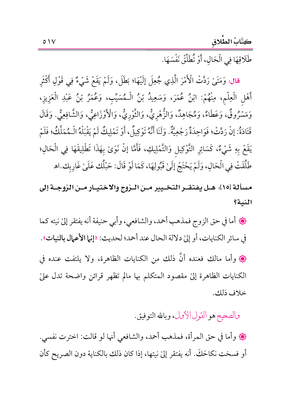 مسألة [١٥]: هل يفتقر التخيير من الزوج والاختيار من الزوجة إلى النية؟