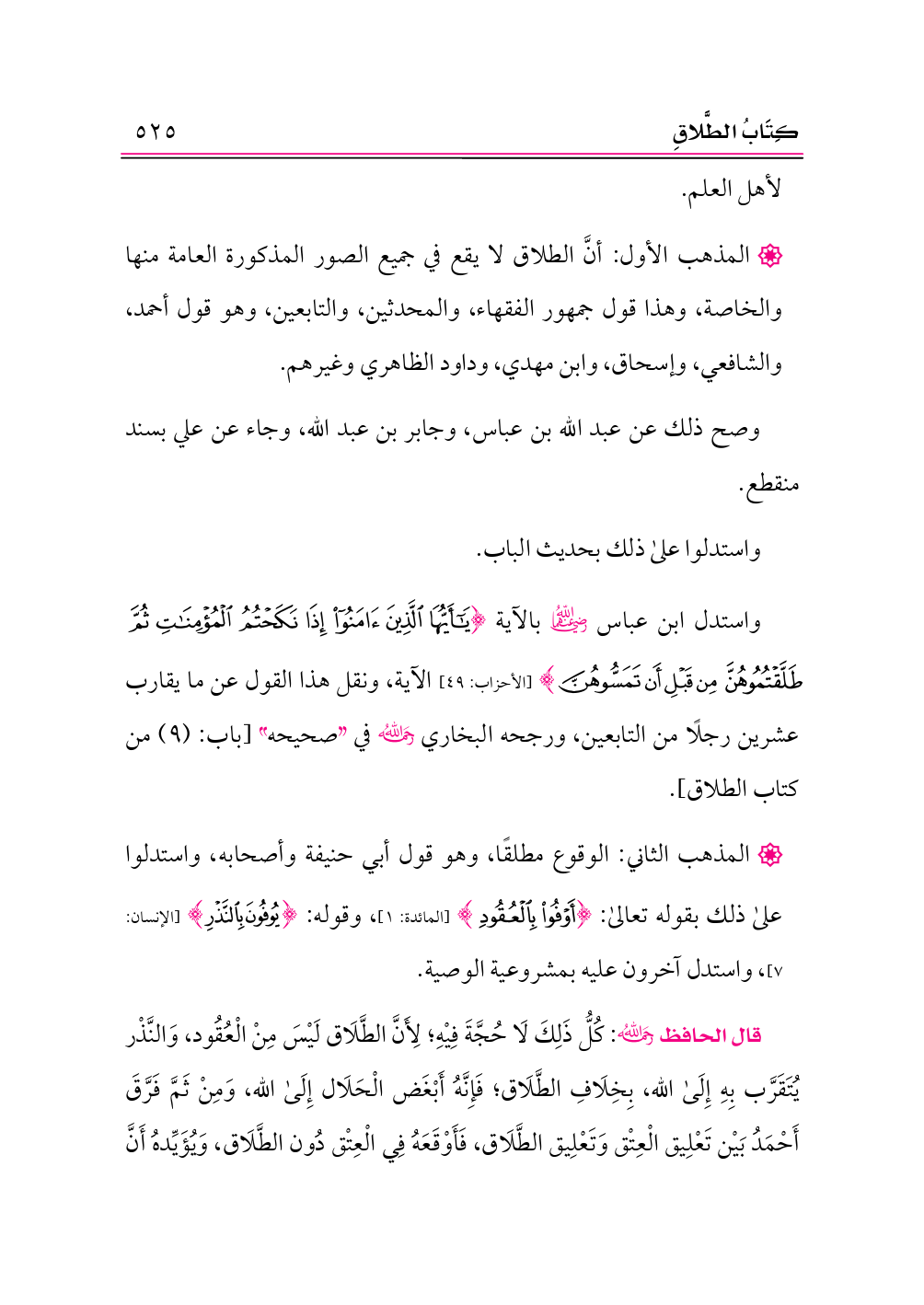 قال الحافظ -رحمه الله-: كُلُّ ذَلِكَ لَا حُجَّةَ فِيْهِ؛ لِأَنَّ الطَّلَاق لَيْسَ مِنْ الْعُقُود، وَالنَّذْر يُتَقَرَّب بِهِ إِلَى الله، بِخِلَافِ الطَّلَاق؛ فَإِنَّهُ أَبْغَض الْحَلَال إِلَى الله، وَمِنْ ثَمَّ فَرَّقَ أَحْمَدُ بَيْن تَعْلِيق الْعِتْق وَتَعْلِيق الطَّلَاق، فَأَوْقَعَهُ فِي الْعِتْق دُون الطَّلَاق، وَيُؤَيِّدهُ أَنَّ