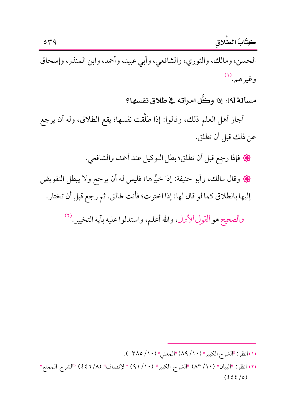 (¬٢) انظر: «البيان» (١٠/ ٨٣) «الشرح الكبير» (١٠/ ٩١) «الإنصاف» (٨/ ٤٤٦) «الشرح الممتع» (٥/ ٤٤٤).