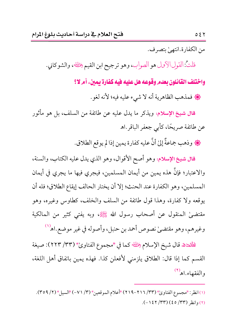 قال شيخ الإسلام: وهو أصح الأقوال، وهو الذي يدل عليه الكتاب، والسنة، والاعتبار؛ فإنَّ هذه يمين من أيمان المسلمين، فيجري فيها ما يجري في أيمان المسلمين، وهو الكفارة عند الحنث؛ إلا أن يختار الحالف إيقاع الطلاق؛ فله أن يوقعه ولا كفارة، وهذا قول طائفة من السلف والخلف، كطاوس وغيره، وهو مقتضى المنقول عن أصحاب رسول الله - صلى الله عليه وسلم -، وبه يفتي كثير من المالكية وغيرهم، وهو مقتضى نصوص أحمد بن حنبل، وأصوله في غير موضع. اهـ (¬١)