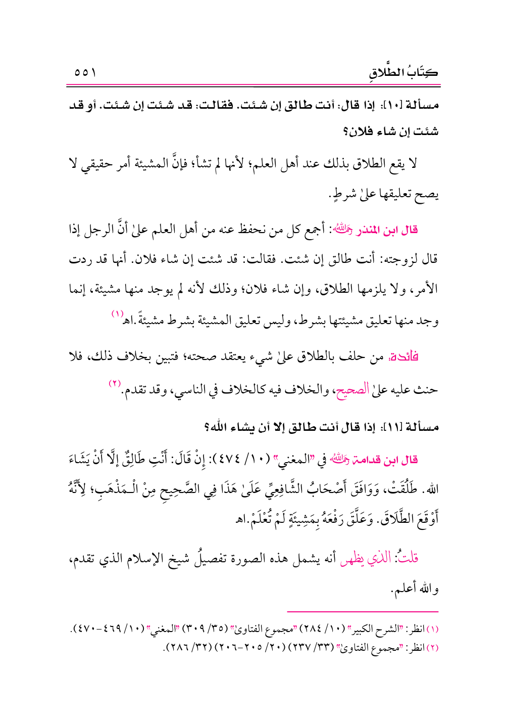 قال ابن قدامة -رحمه الله- في «المغني» (١٠/ ٤٧٤): إِنْ قَالَ: أَنْتِ طَالِقٌ إلَّا أَنْ يَشَاءَ الله. طَلُقَتْ، وَوَافَقَ أَصْحَابُ الشَّافِعِيِّ عَلَى هَذَا فِي الصَّحِيحِ مِنْ الْمَذْهَبِ؛ لِأَنَّهُ أَوْقَعَ الطَّلَاقَ. وَعَلَّقَ رَفْعَهُ بِمَشِيئَةٍ لَمْ تُعْلَمْ. اهـ