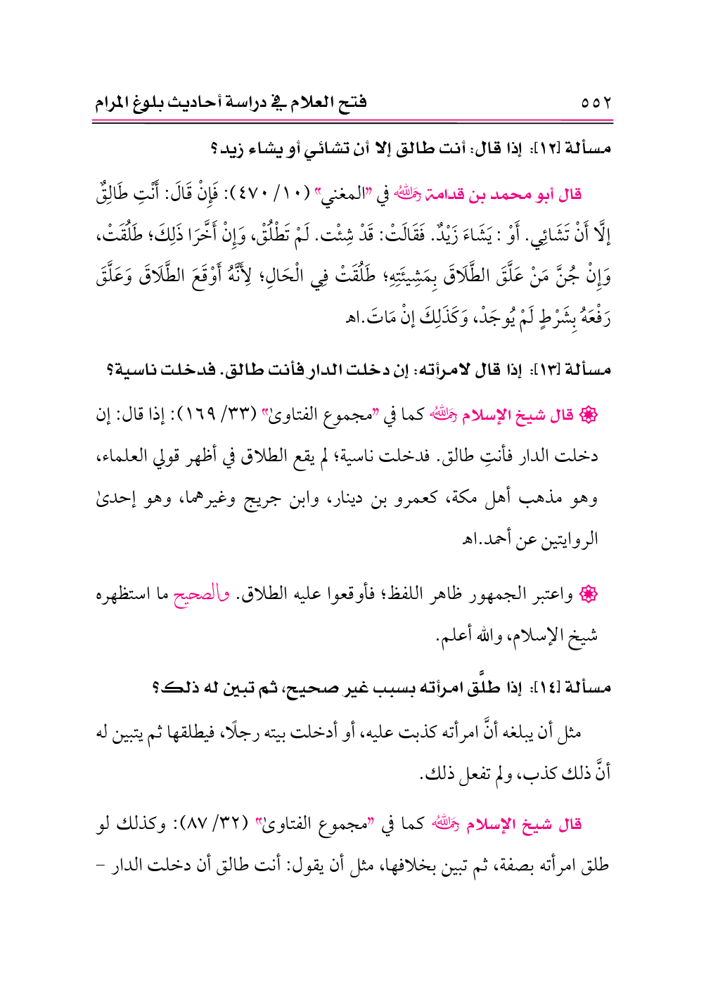 • واعتبر الجمهور ظاهر اللفظ؛ فأوقعوا عليه الطلاق. والصحيح ما استظهره شيخ الإسلام، والله أعلم.