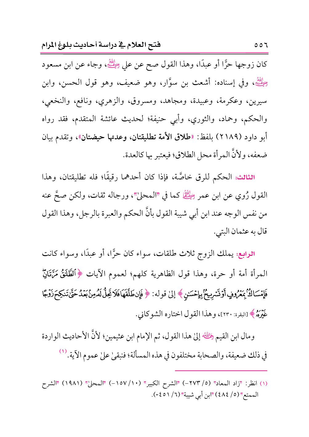 الثالث: الحكم للرق خاصَّة، فإذا كان أحدهما رقيقًا؛ فله تطليقتان، وهذا القول رُوي عن ابن عمر -رضي الله عنهما- كما في «المحلى»، ورجاله ثقات، ولكن صحَّ عنه من نفس الوجه عند ابن أبي شيبة القول بأنَّ الحكم والعبرة بالرجل، وهذا القول قال به عثمان البتي.