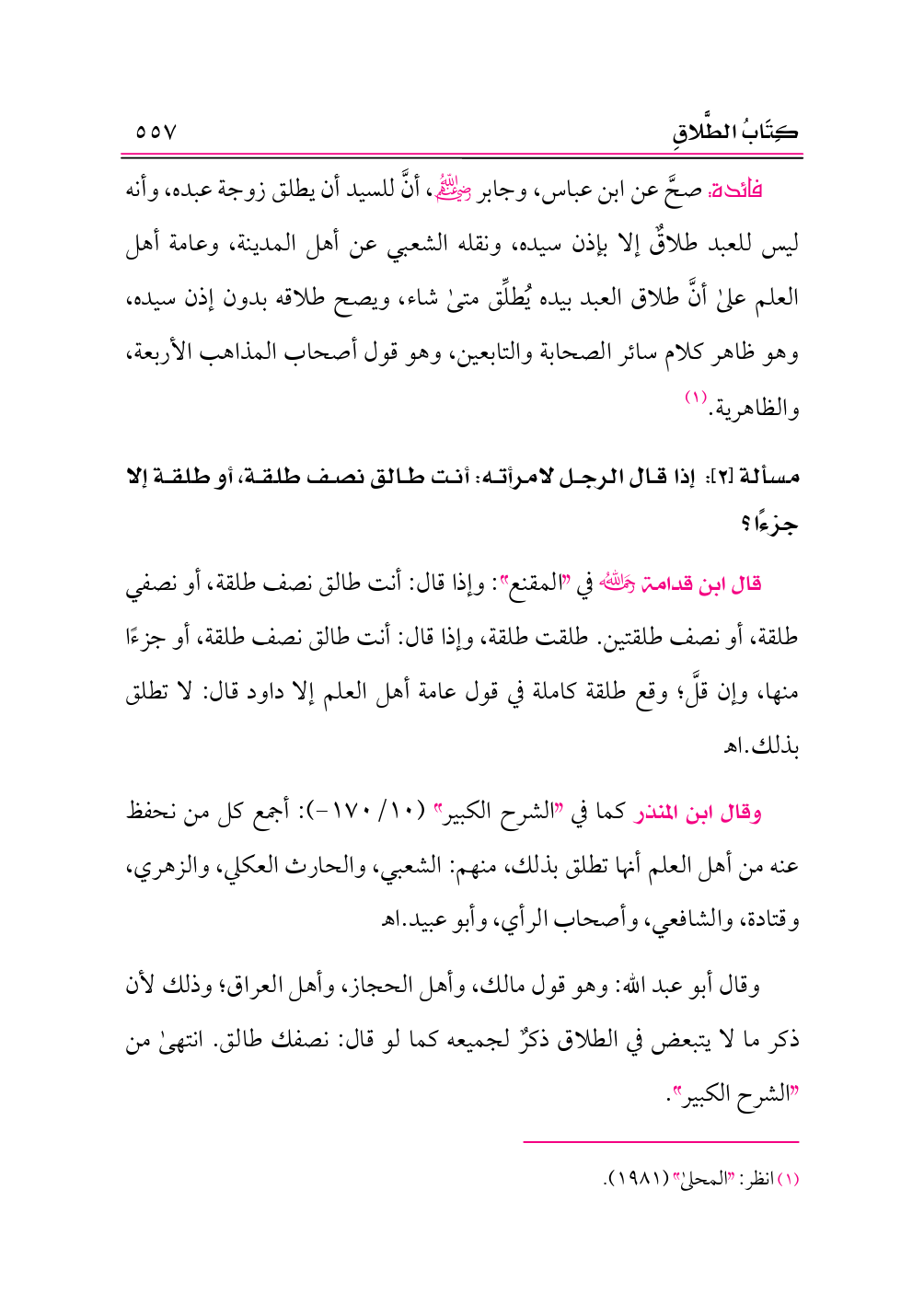 فائدة: صحَّ عن ابن عباس، وجابر -رضي الله عنهم-، أنَّ للسيد أن يطلق زوجة عبده، وأنه ليس للعبد طلاقٌ إلا بإذن سيده، ونقله الشعبي عن أهل المدينة، وعامة أهل العلم على أنَّ طلاق العبد بيده يُطلِّق متى شاء، ويصح طلاقه بدون إذن سيده، وهو ظاهر كلام سائر الصحابة والتابعين، وهو قول أصحاب المذاهب الأربعة، والظاهرية. (¬١)