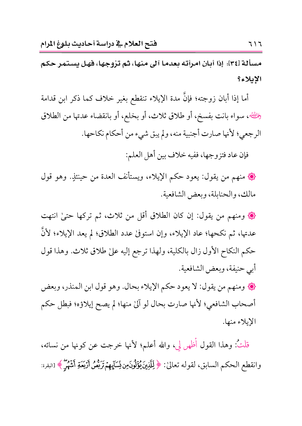 قلتُ: وهذا القول أظهر لي، والله أعلم؛ لأنها خرجت عن كونها من نسائه، وانقطع الحكم السابق، لقوله تعالى: {لِلَّذِينَ يُؤْلُونَ مِنْ نِسَائِهِمْ تَرَبُّصُ أَرْبَعَةِ أَشْهُرٍ} [البقرة: