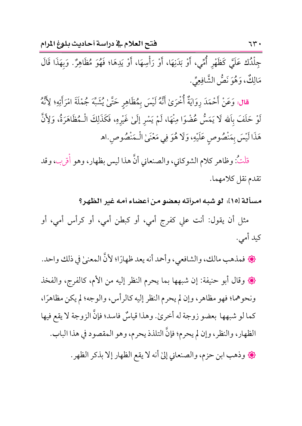 قلتُ: وظاهر كلام الشوكاني، والصنعاني أنَّ هذا ليس بظهار، وهو أقرب، وقد تقدم نقل كلامهما.