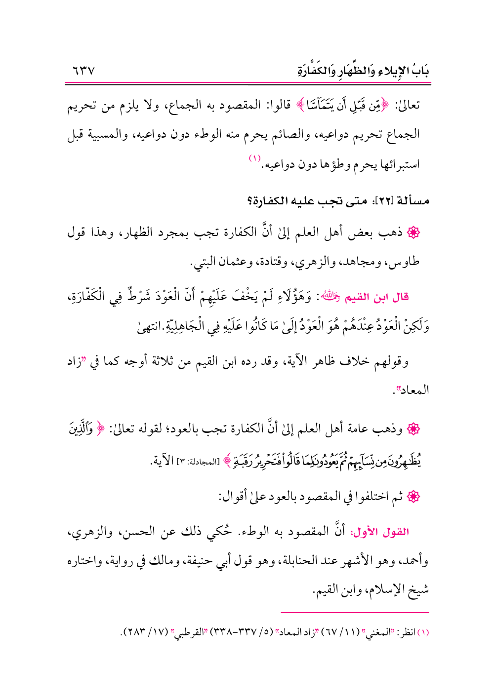 قال ابن القيم -رحمه الله-: وَهَؤُلَاءِ لَمْ يَخْفَ عَلَيْهِمْ أَنّ الْعَوْدَ شَرْطٌ فِي الْكَفّارَةِ، وَلَكِنْ الْعَوْدُ عِنْدَهُمْ هُوَ الْعَوْدُ إلَى مَا كَانُوا عَلَيْهِ فِي الْجَاهِلِيّةِ. انتهى