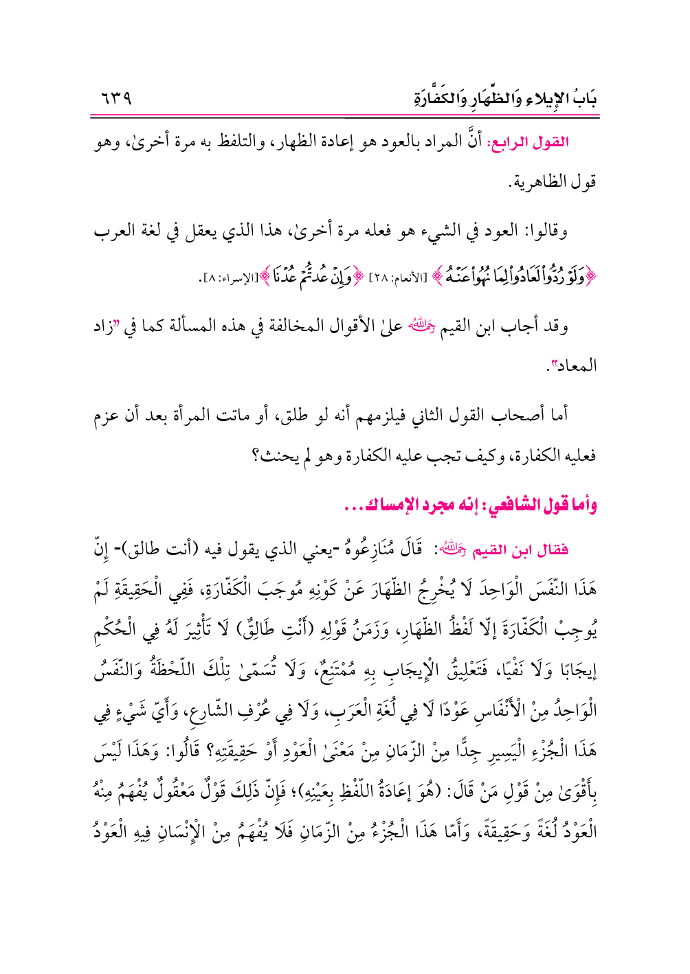 فقال ابن القيم -رحمه الله-: قَالَ مُنَازِعُوهُ يعني الذي يقول فيه (أنت طالق) إِنّ هَذَا النّفَسَ الْوَاحِدَ لَا يُخْرِجُ الظّهَارَ عَنْ كَوْنِهِ مُوجَبَ الْكَفّارَةِ، فَفِي الْحَقِيقَةِ لَمْ يُوجِبْ الْكَفّارَةَ إلّا لَفْظُ الظّهَارِ، وَزَمَنُ قَوْلِهِ (أَنْتِ طَالِقٌ) لَا تَأْثِيرَ لَهُ فِي الْحُكْمِ إيجَابًا وَلَا نَفْيًا، فَتَعْلِيقُ الْإِيجَابِ بِهِ مُمْتَنِعٌ، وَلَا تُسَمّى تِلْكَ اللّحْظَةُ وَالنّفَسُ الْوَاحِدُ مِنْ الْأَنْفَاسِ عَوْدًا لَا فِي لُغَةِ الْعَرَبِ، وَلَا فِي عُرْفِ الشّارِعِ، وَأَيّ شَيْءٍ فِي هَذَا الْجُزْءِ الْيَسِيرِ جِدًّا مِنْ الزّمَانِ مِنْ مَعْنَى الْعَوْدِ أَوْ حَقِيقَتِهِ؟ قَالُوا: وَهَذَا لَيْسَ بِأَقْوَى مِنْ قَوْلِ مَنْ قَالَ: (هُوَ إعَادَةُ اللّفْظِ بِعَيْنِهِ)؛ فَإِنّ ذَلِكَ قَوْلٌ مَعْقُولٌ يُفْهَمُ مِنْهُ الْعَوْدُ لُغَةً وَحَقِيقَةً، وَأَمّا هَذَا الْجُزْءُ مِنْ الزّمَانِ فَلَا يُفْهَمُ مِنْ الْإِنْسَانِ فِيهِ الْعَوْدُ