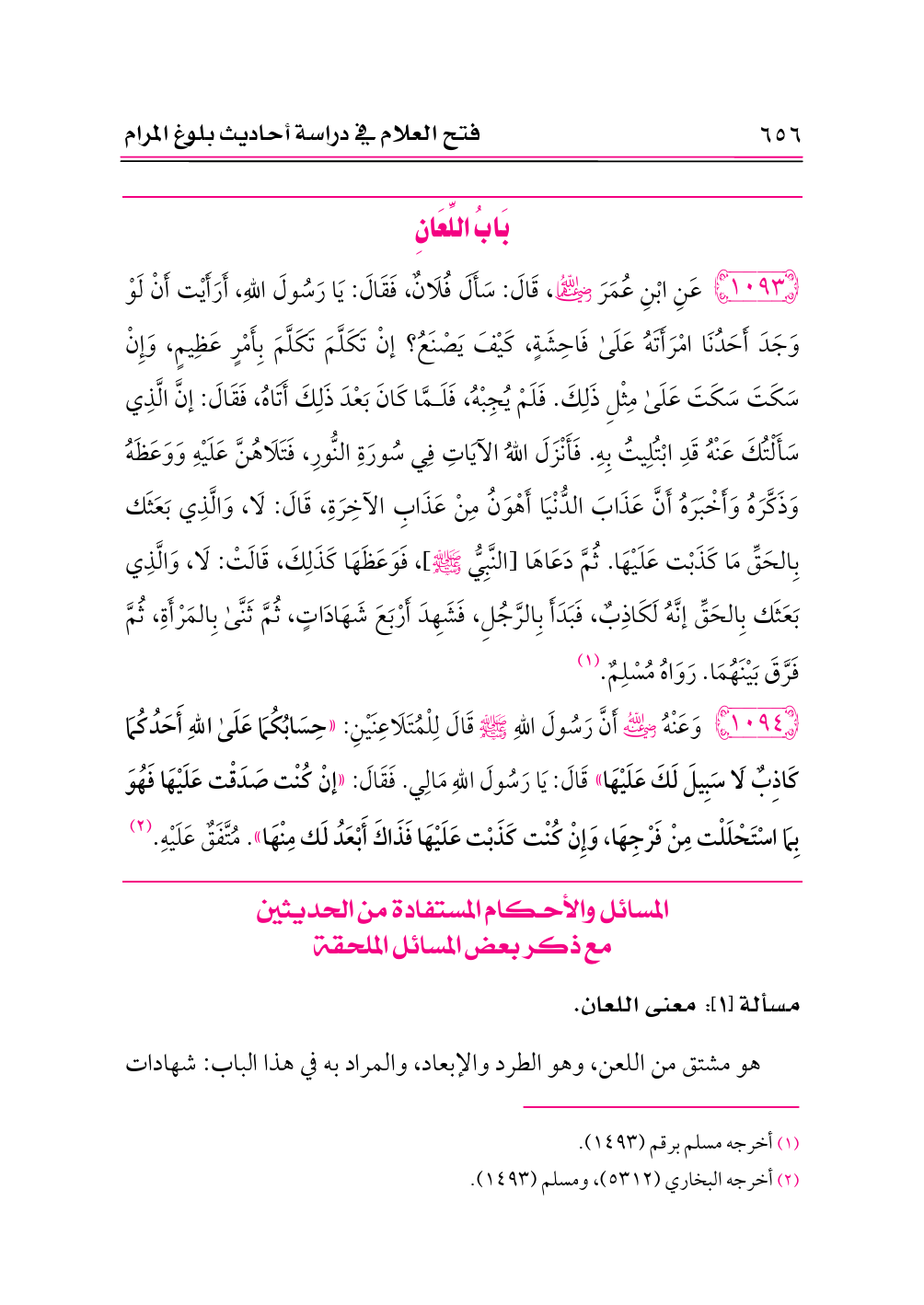 ١٠٩٣ - عَنِ ابْنِ عُمَرَ -رضي الله عنهما-، قَالَ: سَأَلَ فُلَانٌ، فَقَالَ: يَا رَسُولَ اللهِ، أَرَأَيْت أَنْ لَوْ وَجَدَ أَحَدُنَا امْرَأَتَهُ عَلَى فَاحِشَةٍ، كَيْفَ يَصْنَعُ؟ إنْ تَكَلَّمَ تَكَلَّمَ بِأَمْرٍ عَظِيمٍ، وَإِنْ سَكَتَ سَكَتَ عَلَى مِثْلِ ذَلِكَ. فَلَمْ يُجِبْهُ، فَلَمَّا كَانَ بَعْدَ ذَلِكَ أَتَاهُ، فَقَالَ: إنَّ الَّذِي سَأَلْتُكَ عَنْهُ قَدِ ابْتُلِيتُ بِهِ. فَأَنْزَلَ اللهُ الآيَاتِ فِي سُورَةِ النُّورِ، فَتَلَاهُنَّ عَلَيْهِ وَوَعَظَهُ وَذَكَّرَهُ وَأَخْبَرَهُ أَنَّ عَذَابَ الدُّنْيَا أَهْوَنُ مِنْ عَذَابِ الآخِرَةِ، قَالَ: لَا، وَالَّذِي بَعَثَك بِالحَقِّ مَا كَذَبْت عَلَيْهَا. ثُمَّ دَعَاهَا [النَّبِيُّ - صلى الله عليه وسلم -]، فَوَعَظَهَا كَذَلِكَ، قَالَتْ: لَا، وَالَّذِي بَعَثَك بِالحَقِّ إنَّهُ لَكَاذِبٌ، فَبَدَأَ بِالرَّجُلِ، فَشَهِدَ أَرْبَعَ شَهَادَاتٍ، ثُمَّ ثَنَّى بِالمَرْأَةِ، ثُمَّ فَرَّقَ بَيْنَهُمَا. رَوَاهُ مُسْلِمٌ. (¬١)