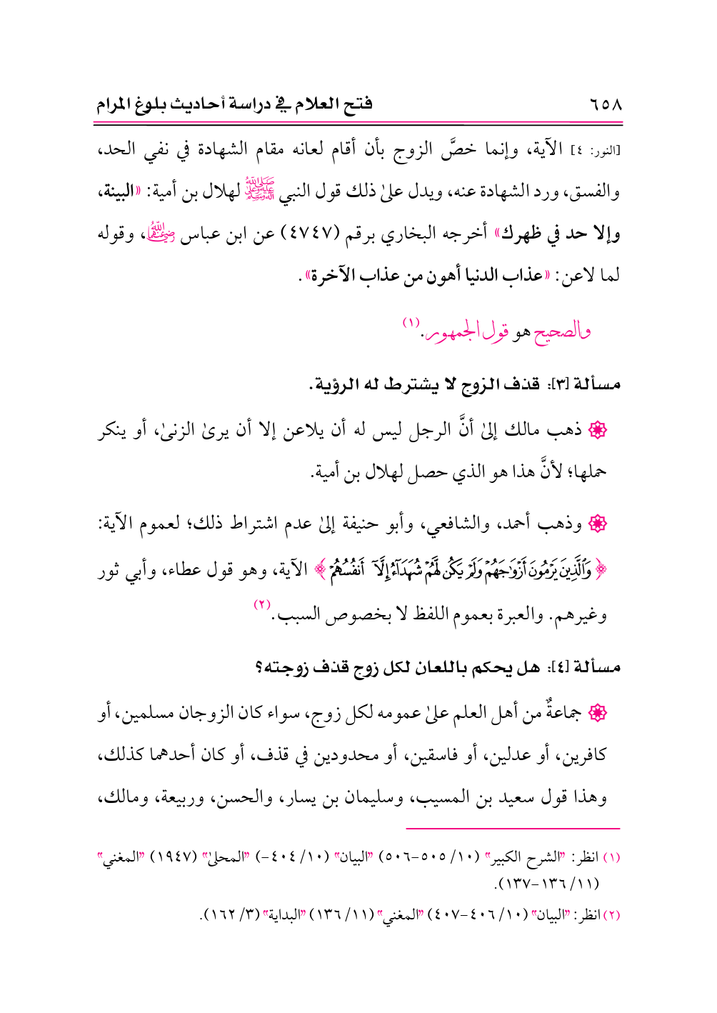 • وذهب أحمد، والشافعي، وأبو حنيفة إلى عدم اشتراط ذلك؛ لعموم الآية: {وَالَّذِينَ يَرْمُونَ أَزْوَاجَهُمْ وَلَمْ يَكُنْ لَهُمْ شُهَدَاءُ إِلَّا أَنْفُسُهُمْ} الآية، وهو قول عطاء، وأبي ثور وغيرهم. والعبرة بعموم اللفظ لا بخصوص السبب. (¬٢)