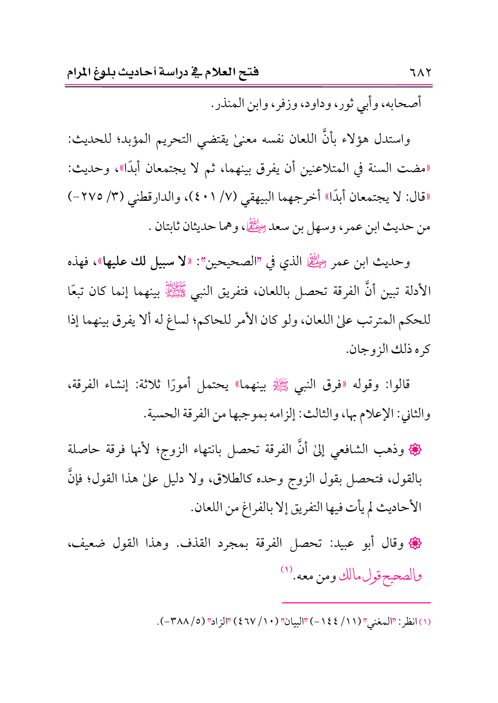 واستدل هؤلاء بأنَّ اللعان نفسه معنى يقتضي التحريم المؤبد؛ للحديث: «مضت السنة في المتلاعنين أن يفرق بينهما، ثم لا يجتمعان أبدًا»، وحديث: «قال: لا يجتمعان أبدًا» أخرجهما البيهقي (٧/ ٤٠١)، والدارقطني (٣/ ٢٧٥ - ) من حديث ابن عمر، وسهل بن سعد -رضي الله عنهما-، وهما حديثان ثابتان.