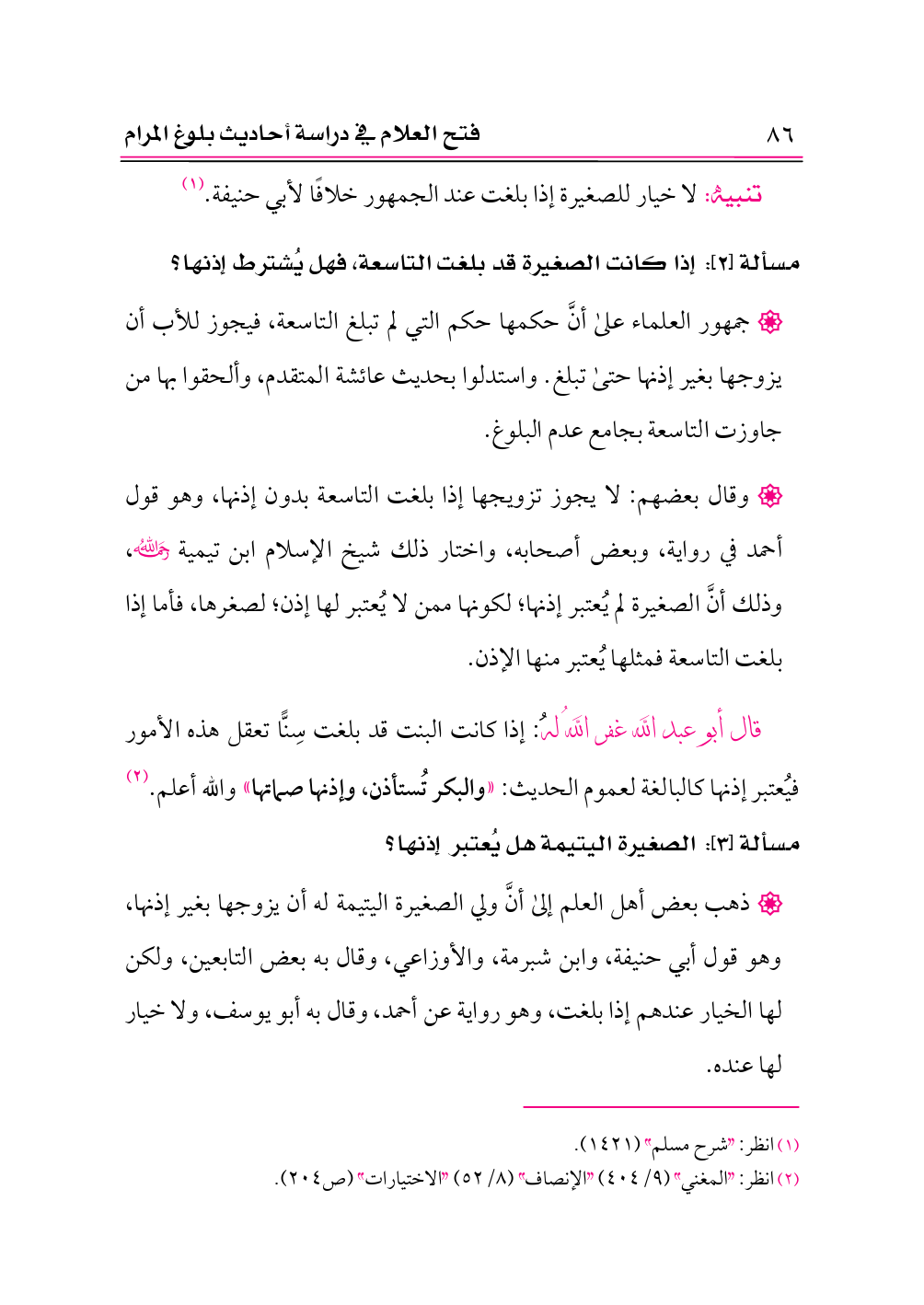 قال أبو عبد الله غفر اللهُ لهُ: إذا كانت البنت قد بلغت سِنًّا تعقل هذه الأمور فيُعتبر إذنها كالبالغة لعموم الحديث: «والبكر تُستأذن، وإذنها صماتها» والله أعلم. (¬٢)