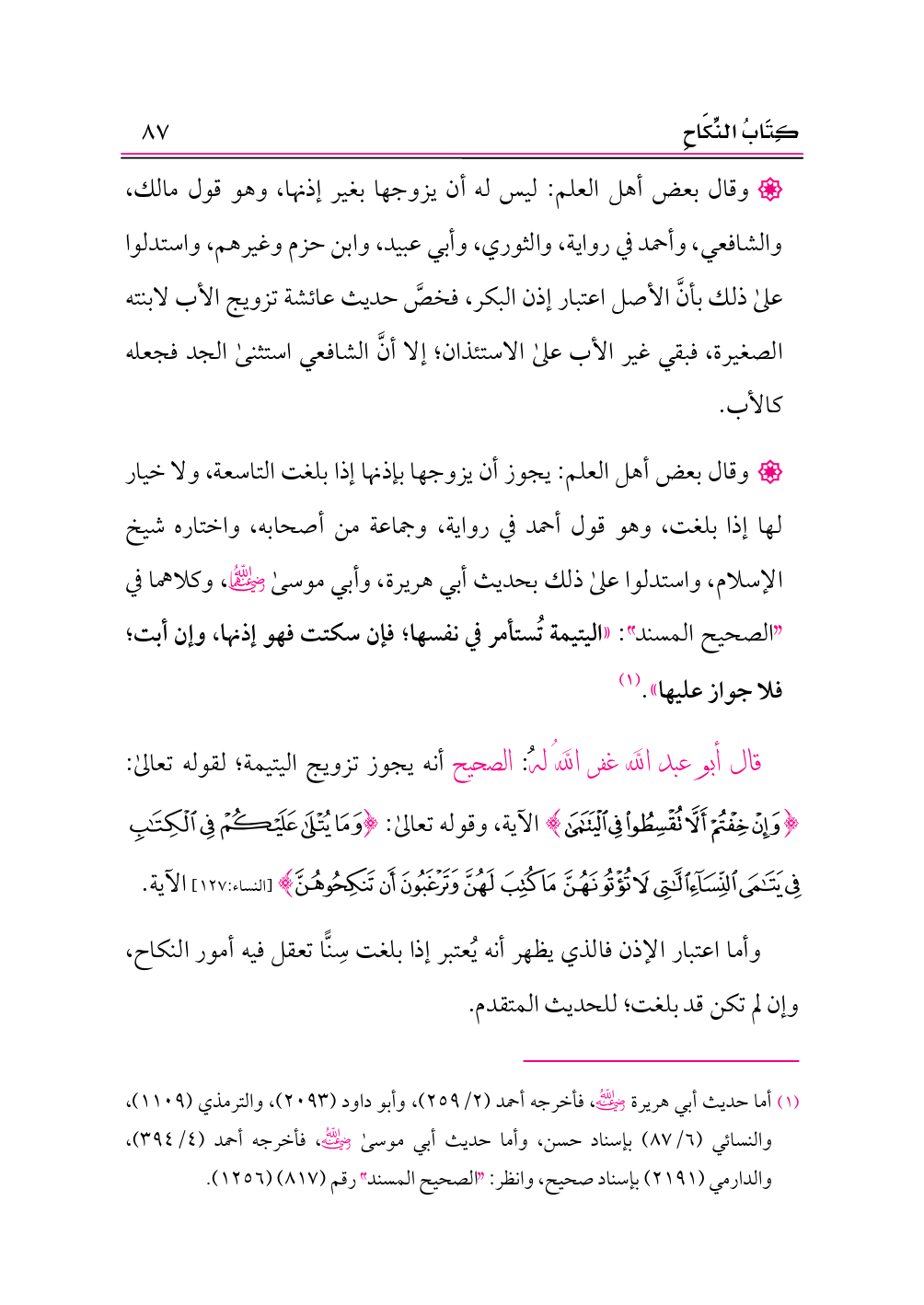 • وقال بعض أهل العلم: يجوز أن يزوجها بإذنها إذا بلغت التاسعة، ولا خيار لها إذا بلغت، وهو قول أحمد في رواية، وجماعة من أصحابه، واختاره شيخ الإسلام، واستدلوا على ذلك بحديث أبي هريرة، وأبي موسى -رضي الله عنهما-، وكلاهما في «الصحيح المسند»: «اليتيمة تُستأمر في نفسها؛ فإن سكتت فهو إذنها، وإن أبت؛ فلا جواز عليها». (¬١)