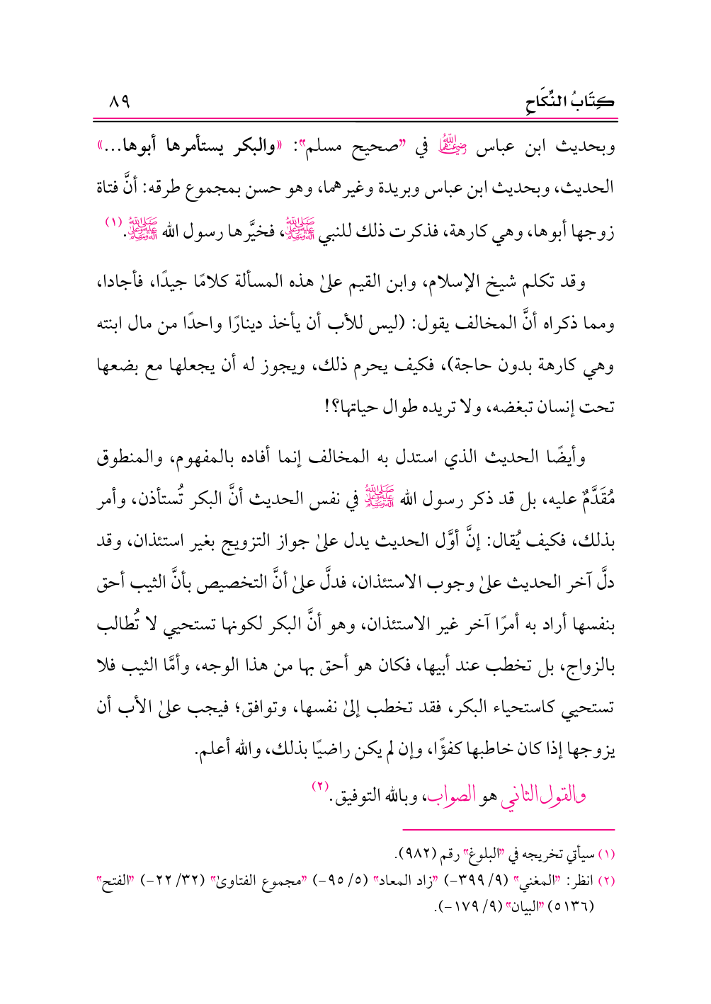 وبحديث ابن عباس -رضي الله عنهما- في «صحيح مسلم»: «والبكر يستأمرها أبوها ... » الحديث، وبحديث ابن عباس وبريدة وغيرهما، وهو حسن بمجموع طرقه: أنَّ فتاة زوجها أبوها، وهي كارهة، فذكرت ذلك للنبي -صلى الله عليه وعلى آله وسلم-، فخيَّرها رسول الله -صلى الله عليه وعلى آله وسلم-. (¬١)