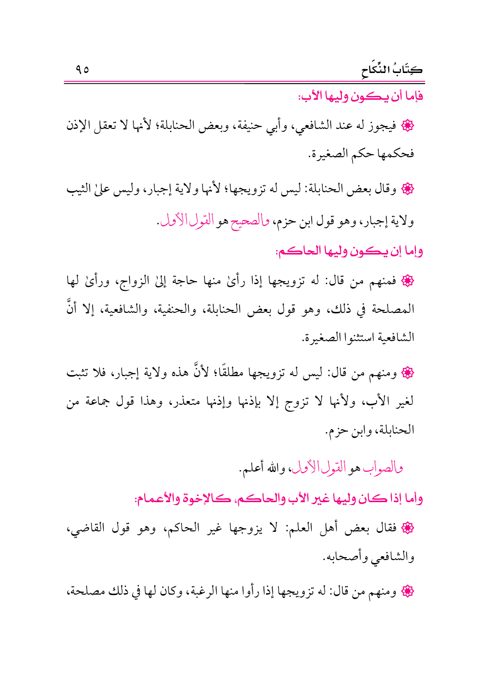 • وقال بعض الحنابلة: ليس له تزويجها؛ لأنها ولاية إجبار، وليس على الثيب ولاية إجبار، وهو قول ابن حزم، والصحيح هو القول الأول.