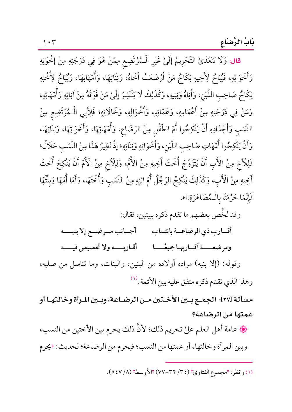 مسألة [٢٧]: الجمع بين الأختين من الرضاعة، وبين المرأة وخالتها أو عمتها من الرضاعة؟