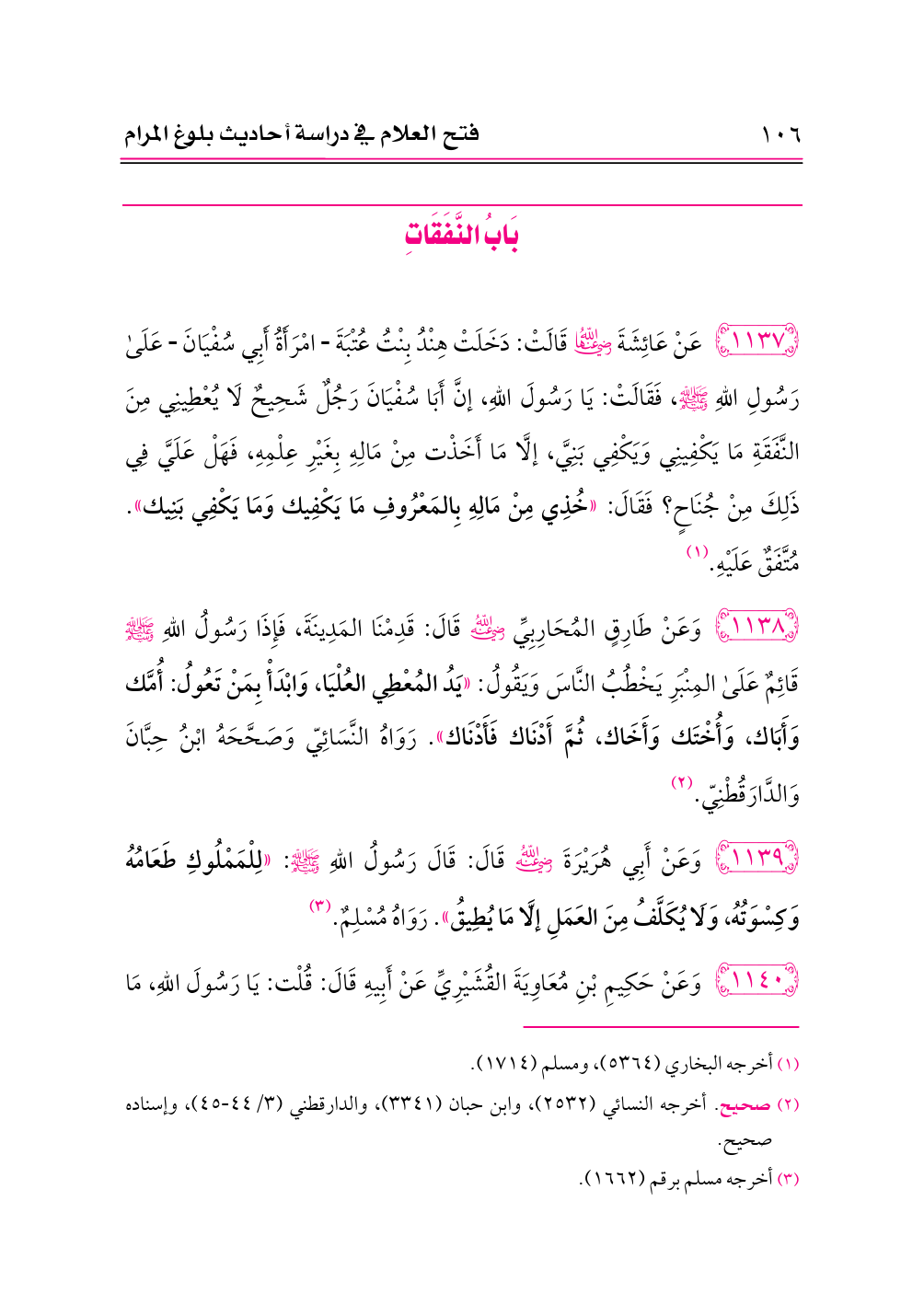 ١١٣٧ - عَنْ عَائِشَةَ -رضي الله عنها- قَالَتْ: دَخَلَتْ هِنْدُ بِنْتُ عُتْبَةَ امْرَأَةُ أَبِي سُفْيَانَ عَلَى رَسُولِ اللهِ - صلى الله عليه وسلم -، فَقَالَتْ: يَا رَسُولَ اللهِ، إنَّ أَبَا سُفْيَانَ رَجُلٌ شَحِيحٌ لَا يُعْطِينِي مِنَ النَّفَقَةِ مَا يَكْفِينِي وَيَكْفِي بَنِيَّ، إلَّا مَا أَخَذْت مِنْ مَالِهِ بِغَيْرِ عِلْمِهِ، فَهَلْ عَلَيَّ فِي ذَلِكَ مِنْ جُنَاحٍ؟ فَقَالَ: «خُذِي مِنْ مَالِهِ بِالمَعْرُوفِ مَا يَكْفِيك وَمَا يَكْفِي بَنِيك». مُتَّفَقٌ عَلَيْهِ. (¬١)
