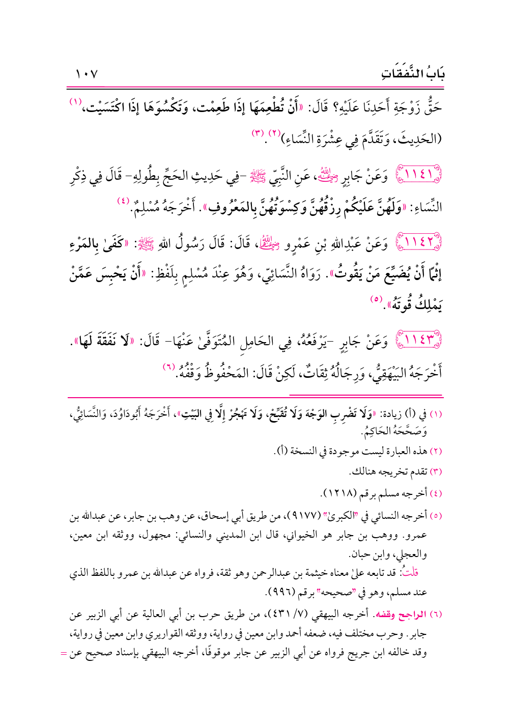 ١١٤٣ - وَعَنْ جَابِرٍ -يَرْفَعُهُ، فِي الحَامِلِ المُتَوَفَّى عَنْهَا- قَالَ: «لَا نَفَقَةَ لَهَا». أَخْرَجَهُ البَيْهَقِيُّ، وَرِجَالُهُ ثِقَاتٌ، لَكِنْ قَالَ: المَحْفُوظُ وَقْفُهُ. (¬٦)