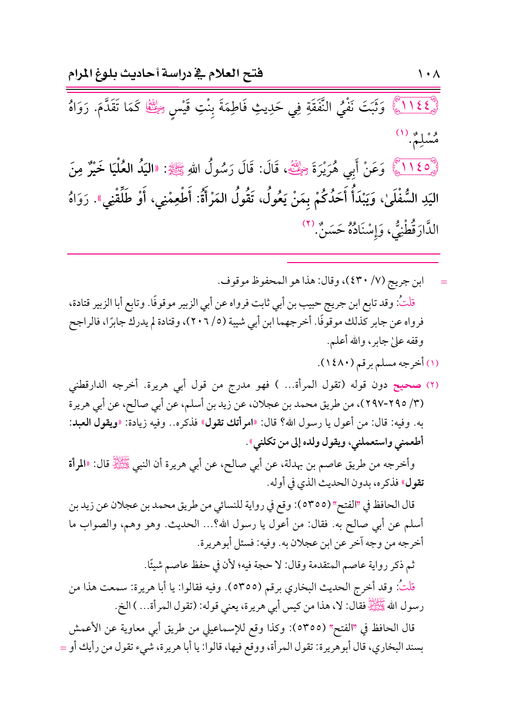 ١١٤٥ - وَعَنْ أَبِي هُرَيْرَةَ -رضي الله عنه-، قَالَ: قَالَ رَسُولُ اللهِ - صلى الله عليه وسلم -: «اليَدُ العُلْيَا خَيْرٌ مِنَ اليَدِ السُّفْلَى، وَيَبْدَأُ أَحَدُكُمْ بِمَنْ يَعُولُ، تَقُولُ المَرْأَةُ: أَطْعِمْنِي، أَوْ طَلِّقْنِي». رَوَاهُ الدَّارَقُطْنِيُّ، وَإِسْنَادُهُ حَسَنٌ. (¬٢)