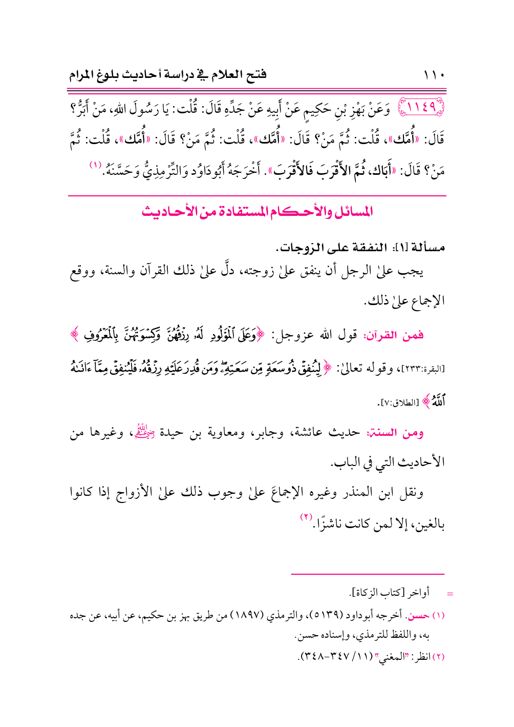 ونقل ابن المنذر وغيره الإجماعَ على وجوب ذلك على الأزواج إذا كانوا بالغين، إلا لمن كانت ناشزًا. (¬٢)