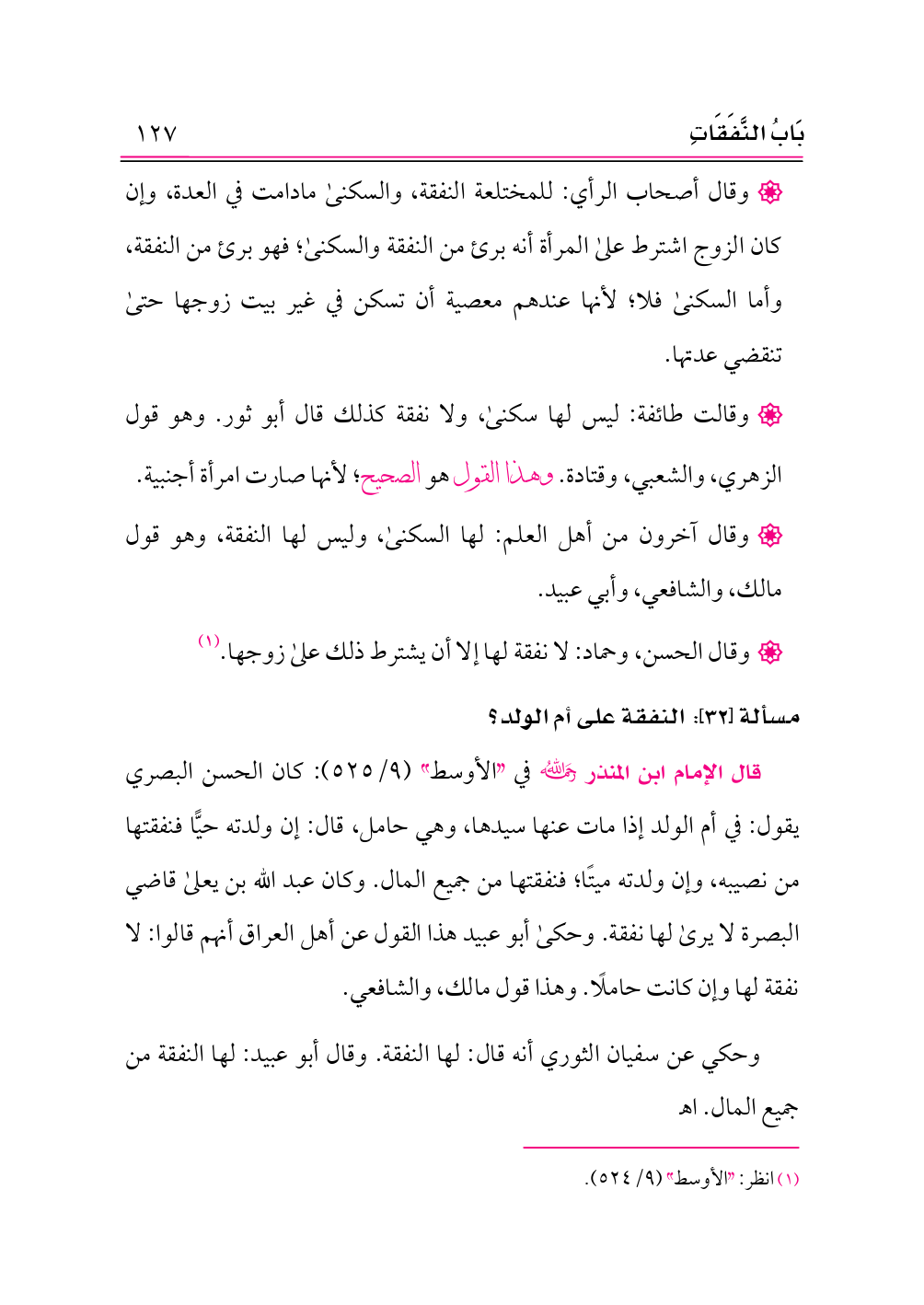 قال الإمام ابن المنذر -رحمه الله- في «الأوسط» (٩/ ٥٢٥): كان الحسن البصري يقول: في أم الولد إذا مات عنها سيدها، وهي حامل، قال: إن ولدته حيًّا فنفقتها من نصيبه، وإن ولدته ميتًا؛ فنفقتها من جميع المال. وكان عبد الله بن يعلى قاضي البصرة لا يرى لها نفقة. وحكى أبو عبيد هذا القول عن أهل العراق أنهم قالوا: لا نفقة لها وإن كانت حاملًا. وهذا قول مالك، والشافعي.