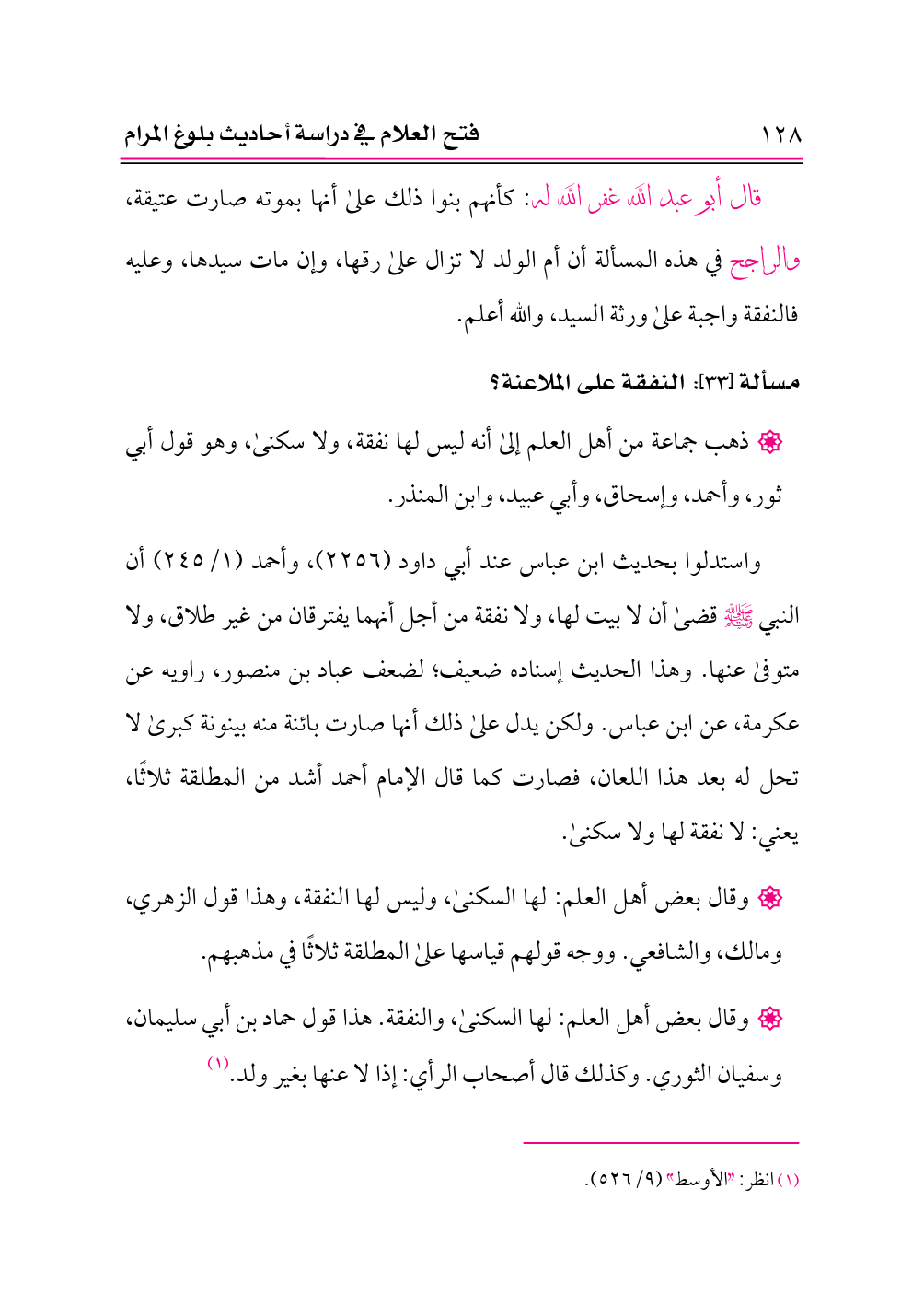 واستدلوا بحديث ابن عباس عند أبي داود (٢٢٥٦)، وأحمد (١/ ٢٤٥) أن النبي - صلى الله عليه وسلم - قضى أن لا بيت لها، ولا نفقة من أجل أنهما يفترقان من غير طلاق، ولا متوفى عنها. وهذا الحديث إسناده ضعيف؛ لضعف عباد بن منصور، راويه عن عكرمة، عن ابن عباس. ولكن يدل على ذلك أنها صارت بائنة منه بينونة كبرى لا تحل له بعد هذا اللعان، فصارت كما قال الإمام أحمد أشد من المطلقة ثلاثًا، يعني: لا نفقة لها ولا سكنى.