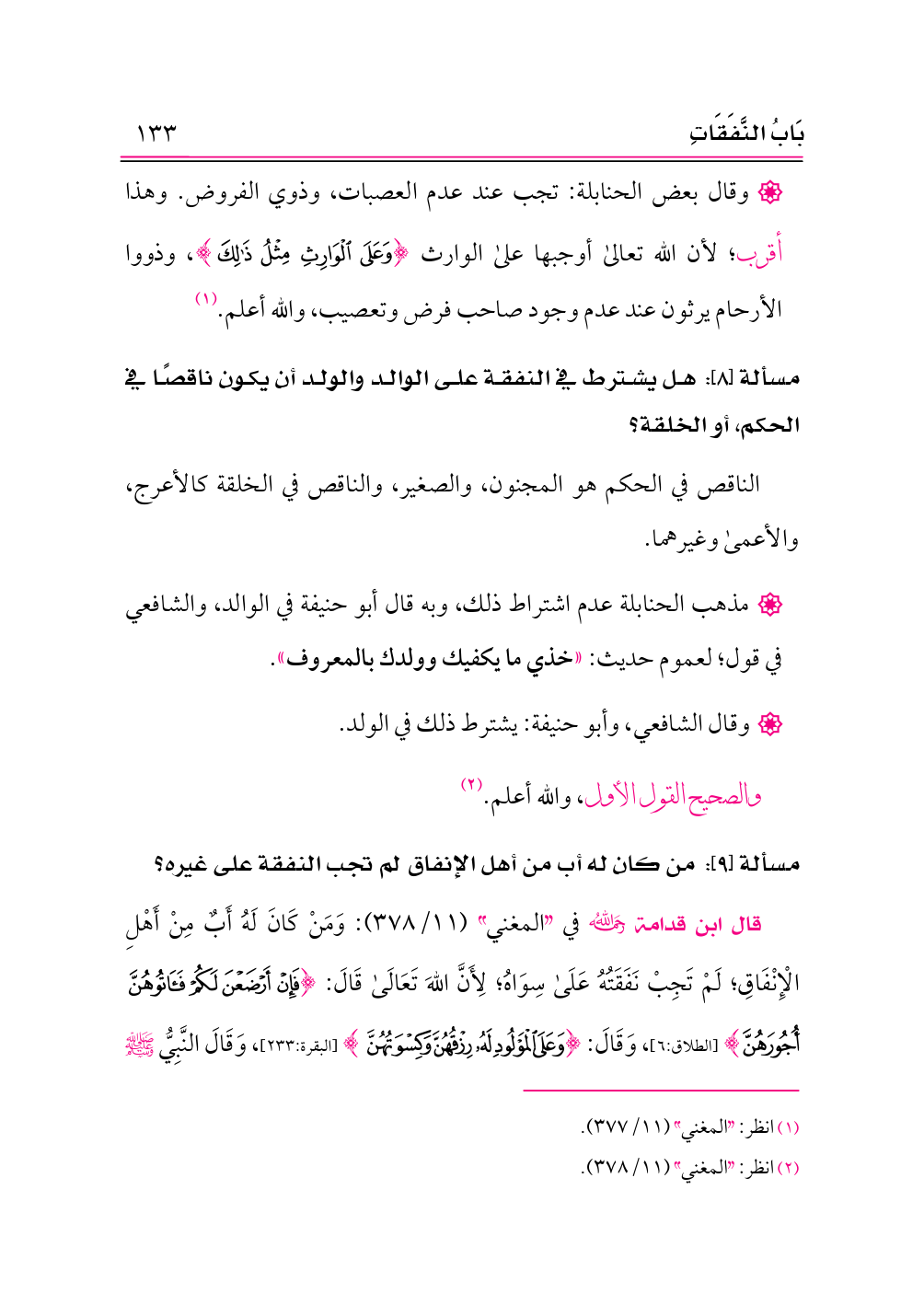 مسألة [٨]: هل يشترط في النفقة على الوالد والولد أن يكون ناقصًا في الحكم، أو الخلقة؟