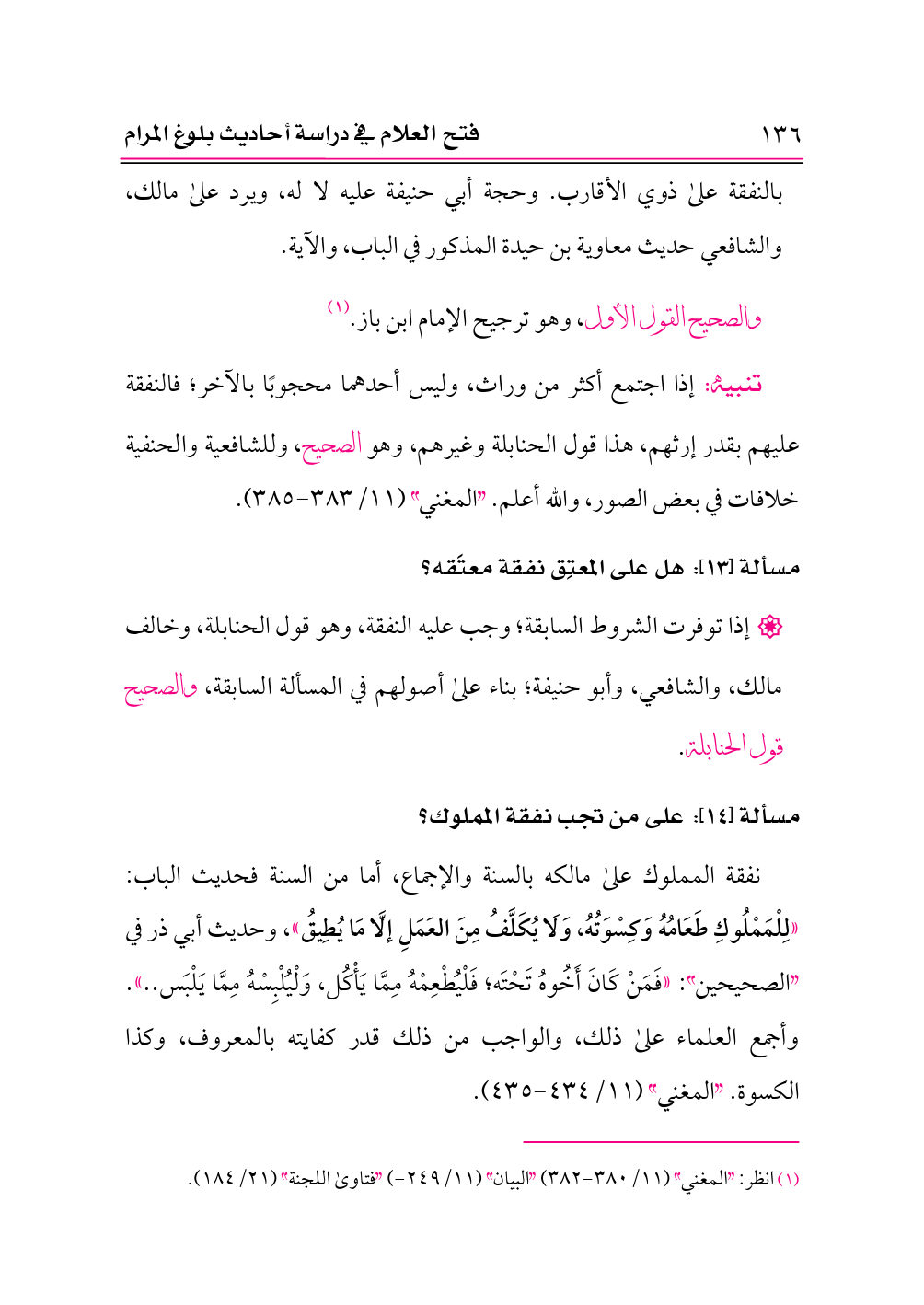 تنبيه: إذا اجتمع أكثر من وراث، وليس أحدهما محجوبًا بالآخر؛ فالنفقة عليهم بقدر إرثهم، هذا قول الحنابلة وغيرهم، وهو الصحيح، وللشافعية والحنفية خلافات في بعض الصور، والله أعلم. «المغني» (١١/ ٣٨٣ - ٣٨٥).