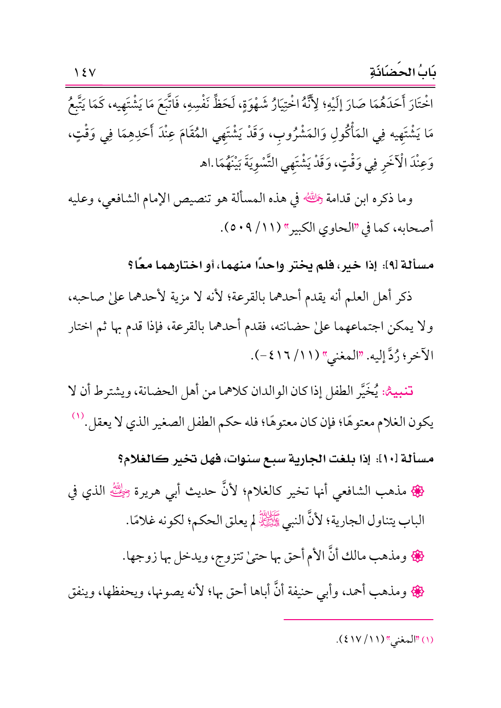 تنبيه: يُخَيَّر الطفل إذا كان الوالدان كلاهما من أهل الحضانة، ويشترط أن لا يكون الغلام معتوهًا؛ فإن كان معتوهًا؛ فله حكم الطفل الصغير الذي لا يعقل. (¬١)