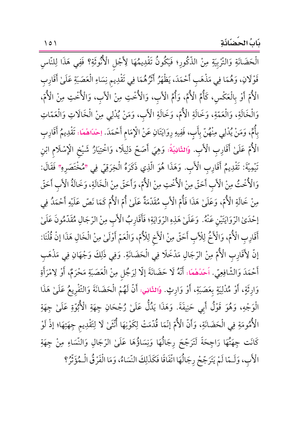 الْحَضَانَةِ وَالتّرْبِيَةِ مِنْ الذّكُورِ؛ فَيَكُونُ تَقْدِيمُهَا لِأَجْلِ الْأُنُوثَةِ؟ فَفِي هَذَا لِلنّاسِ قَوْلَانِ، وَهُمَا فِي مَذْهَبِ أَحْمَدَ، يَظْهَرُ أَثَرُهُمَا فِي تَقْدِيمِ نِسَاءِ الْعَصَبَةِ عَلَى أَقَارِبِ الْأُمّ أَوْ بِالْعَكْسِ، كَأُمِّ الْأُمِّ، وَأُمِّ الْأَبِ، وَالْأُخْتِ مِنْ الْأَبِ، وَالْأُخْتِ مِنْ الْأُمّ، وَالْخَالَةِ، وَالْعَمّةِ، وَخَالَةِ الْأُمّ، وَخَالَةِ الْأَبِ، وَمَنْ يُدْلِي مِنْ الْخَالَاتِ وَالْعَمّاتِ بِأُمٍّ، وَمَنْ يُدْلِي مِنْهُنّ بِأَبٍ، فَفِيهِ رِوَايَتَانِ عَنْ الْإِمَامِ أَحْمَدَ. إحْدَاهُمَا: تَقْدِيمُ أَقَارِبِ الْأُمّ عَلَى أَقَارِبِ الْأَبِ. وَالثّانِيَةُ: وَهِيَ أَصَحّ دَلِيلًا، وَاخْتِيَارُ شَيْخِ الْإِسْلَامِ ابْنِ تَيْمِيّةَ: تَقْدِيمُ أَقَارِبِ الْأَبِ. وَهَذَا هُوَ الّذِي ذَكَرَهُ الْخِرَقِيّ فِي «مُخْتَصَرِهِ» فَقَالَ: وَالْأُخْتُ مِنْ الْأَبِ أَحَقّ مِنْ الْأُخْتِ مِنْ الْأُمّ، وَأَحَقّ مِنْ الْخَالَةِ، وَخَالَةُ الْأَبِ أَحَقّ مِنْ خَالَةِ الْأُمّ، وَعَلَى هَذَا فَأُمّ الْأَبِ مُقَدّمَةٌ عَلَى أُمّ الْأُمّ كَمَا نَصّ عَلَيْهِ أَحْمَدُ فِي إحْدَى الرّوَايَتَيْنِ عَنْهُ. وَعَلَى هَذِهِ الرّوَايَةِ؛ فَأَقَارِبُ الْأَبِ مِنْ الرّجَالِ مُقَدّمُونَ عَلَى أَقَارِبِ الْأُمّ، وَالْأَخُ لِلْأَبِ أَحَقّ مِنْ الْأَخِ لِلْأُمّ، وَالْعَمّ أَوْلَى مِنْ الْخَالِ هَذَا إنْ قُلْنَا: إنّ لِأَقَارِبِ الْأُمّ مِنْ الرّجَالِ مَدْخَلًا فِي الْحَضَانَةِ. وَفِي ذَلِكَ وَجْهَانِ فِي مَذْهَبِ أَحْمَدَ وَالشّافِعِيّ.