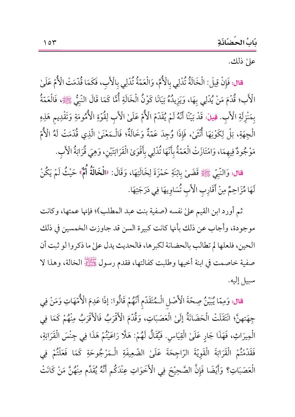 قال: فَإِنْ قِيلَ: الْخَالَةُ تُدْلِي بِالْأُمِّ، وَالْعَمّةُ تُدْلِي بِالْأَبِ، فَكَمَا قُدّمَتْ الْأُمّ عَلَى الْأَب؛ قُدّمَ مَنْ يُدْلِي بِهَا، وَيَزِيدُهُ بَيَانًا كَوْنُ الْخَالَةِ أُمًّا كَمَا قَالَ النّبِيُّ - صلى الله عليه وسلم -، فَالْعَمّةُ بِمَنْزِلَةِ الْأَبِ. قِيلَ: قَدْ بَيّنّا أَنّهُ لَمْ يُقَدّمْ الْأُمّ عَلَى الْأَبِ لِقُوّةِ الْأُمُومَةِ وَتَقْدِيمِ هَذِهِ الْجِهَةِ، بَلْ لِكَوْنِهَا أُنْثَى، فَإِذَا وُجِدَ عَمّةٌ وَخَالَةٌ؛ فَالْمَعْنَى الّذِي قُدّمَتْ لَهُ الْأُمّ مَوْجُودٌ فِيهِمَا، وَامْتَازَتْ الْعَمّةُ بِأَنّهَا تُدْلِي بِأَقْوَى الْقَرَابَتَيْنِ، وَهِيَ قُرَابَةُ الْأَبِ.