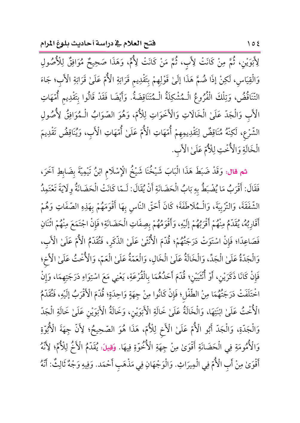 لِأَبَوَيْنِ، ثُمَّ مِنْ كَانَتْ لِأَبٍ، ثُمَّ مَنْ كَانَتْ لِأُمٍّ، وَهَذَا صَحِيحٌ مُوَافِقٌ لِلْأُصُولِ وَالْقِيَاسِ، لَكِنْ إذَا ضُمَّ هَذَا إلَى قَوْلِهِمْ بِتَقْدِيمِ قَرَابَةِ الْأُمّ عَلَى قَرَابَةِ الْأَبِ؛ جَاءَ التّنَاقُضُ، وَتِلْكَ الْفُرُوعُ الْمُشْكِلَةُ الْمُتَنَاقِضَةُ. وَأَيْضًا فَقَدْ قَالُوا بِتَقْدِيمِ أُمّهَاتِ الْأَبِ وَالْجَدّ عَلَى الْخَالَاتِ وَالْأَخَوَاتِ لِلْأُمّ، وَهُوَ الصّوَابُ الْمُوَافِقُ لِأُصُولِ الشّرْعِ، لَكِنّهُ مُنَاقِضٌ لِتَقْدِيمِهِمْ أُمّهَاتِ الْأُمّ عَلَى أُمّهَاتِ الْأَبِ، وَيُنَاقِضُ تَقْدِيمَ الْخَالَةِ وَالْأُخْتِ لِلْأُمّ عَلَى الْأَبِ.