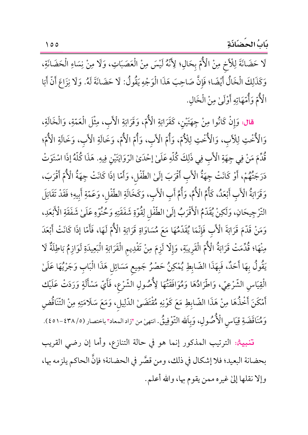 قال: وَإِنْ كَانُوا مِنْ جِهَتَيْنِ، كَقَرَابَةِ الْأُمّ، وَقَرَابَةِ الْأَبِ، مِثْلَ الْعَمّةِ، وَالْخَالَةِ، وَالْأُخْتِ لِلْأَبِ، وَالْأُخْتِ لِلْأُمّ، وَأُمّ الْأَبِ، وَأُمّ الْأُمّ، وَخَالَةِ الْأَبِ، وَخَالَةِ الْأُمّ؛ قُدِّمَ مَنْ فِي جِهَةِ الْأَبِ فِي ذَلِكَ كُلّهِ عَلَى إحْدَى الرّوَايَتَيْنِ فِيهِ. هَذَا كُلّهُ إذَا اسْتَوَتْ دَرَجَتُهُمْ، أَوْ كَانَتْ جِهَةُ الْأَبِ أَقْرَبَ إلَى الطّفْلِ، وَأَمّا إذَا كَانَتْ جِهَةُ الْأُمّ أَقْرَبَ، وَقَرَابَةُ الْأَبِ أَبْعَدُ، كَأُمِّ الْأُمِّ، وَأُمِّ أَبِ الْأَبِ، وَكَخَالَةِ الطّفْلِ، وَعَمّةِ أَبِيهِ؛ فَقَدْ تَقَابَلَ التّرْجِيحَانِ، وَلَكِنْ يُقَدّمُ الْأَقْرَبُ إلَى الطّفْلِ لِقُوّةِ شَفَقَتِهِ وَحُنُوّهِ عَلَى شَفَقَةِ الْأَبْعَدِ، وَمَنْ قَدّمَ قَرَابَةَ الْأَبِ فَإِنّمَا يُقَدّمُهَا مَعَ مُسَاوَاةِ قَرَابَةِ الْأُمّ لَهَا، فَأَمّا إذَا كَانَتْ أَبْعَدَ مِنْهَا؛ قُدِّمَتْ قَرَابَةُ الْأُمّ الْقَرِيبَةِ، وَإِلّا لَزِمَ مِنْ تَقْدِيمِ الْقَرَابَةِ الْبَعِيدَةِ لَوَازِمُ بَاطِلَةٌ لَا يَقُولُ بِهَا أَحَدٌ، فَبِهَذَا الضّابِطِ يُمْكِنُ حَصْرُ جَمِيعِ مَسَائِلِ هَذَا الْبَابِ وَجَرْيُهَا عَلَى الْقِيَاسِ الشّرْعِيّ، وَاطّرَادُهَا وَمُوَافَقَتُهَا لِأُصُولِ الشّرْعِ، فَأَيّ مَسْأَلَةٍ وَرَدَتْ عَلَيْك أَمْكَنَ أَخْذُهَا مِنْ هَذَا الضّابِطِ مَعَ كَوْنِهِ مُقْتَضَى الدّلِيلِ، وَمَعَ سَلَامَتِهِ مِنْ التّنَاقُضِ وَمُنَاقَضَةِ قِيَاسِ الْأُصُولِ، وَبِاَلله التّوْفِيقُ. انتهى من «زاد المعاد» باختصار (٥/ ٤٣٨ - ٤٥١).