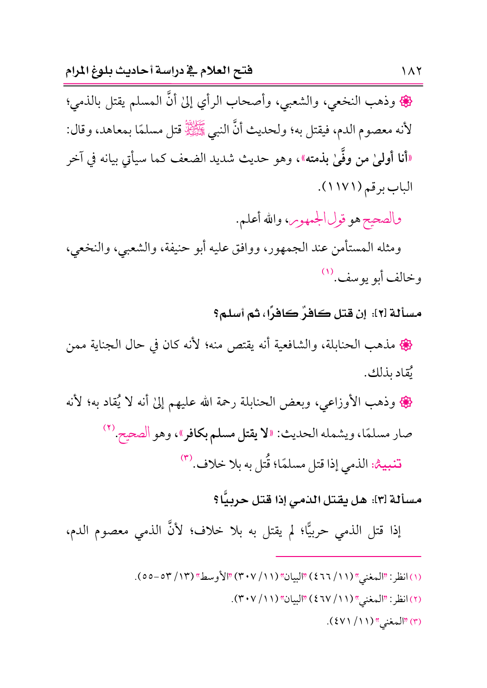 • وذهب النخعي، والشعبي، وأصحاب الرأي إلى أنَّ المسلم يقتل بالذمي؛ لأنه معصوم الدم، فيقتل به؛ ولحديث أنَّ النبي -صلى الله عليه وعلى آله وسلم- قتل مسلمًا بمعاهد، وقال: «أنا أولى من وفَّى بذمته»، وهو حديث شديد الضعف كما سيأتي بيانه في آخر الباب برقم (١١٧١).