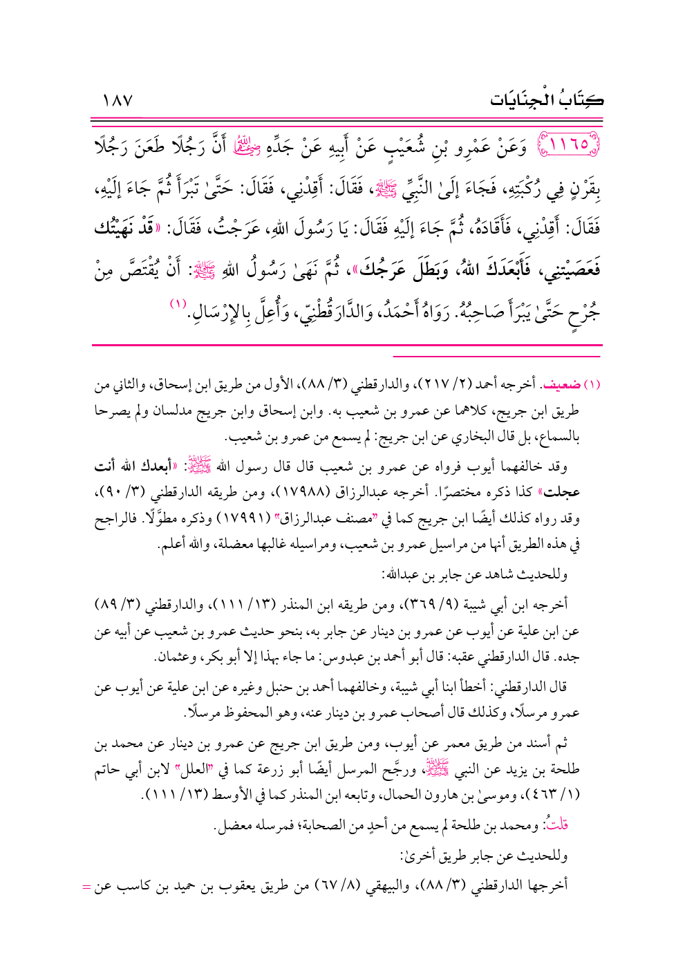 ١١٦٥ - وَعَنْ عَمْرِو بْنِ شُعَيْبٍ عَنْ أَبِيهِ عَنْ جَدِّهِ -رضي الله عنهما- أَنَّ رَجُلًا طَعَنَ رَجُلًا بِقَرْنٍ فِي رُكْبَتِهِ، فَجَاءَ إلَى النَّبِيِّ - صلى الله عليه وسلم -، فَقَالَ: أَقِدْنِي، فَقَالَ: حَتَّى تَبْرَأَ ثُمَّ جَاءَ إلَيْهِ، فَقَالَ: أَقِدْنِي، فَأَقَادَهُ، ثُمَّ جَاءَ إلَيْهِ فَقَالَ: يَا رَسُولَ اللهِ، عَرَجْتُ، فَقَالَ: «قَدْ نَهَيْتُك فَعَصَيْتنِي، فَأَبْعَدَكَ اللهُ، وَبَطَلَ عَرَجُكَ»، ثُمَّ نَهَى رَسُولُ اللهِ - صلى الله عليه وسلم -: أَنْ يُقْتَصَّ مِنْ جُرْحٍ حَتَّى يَبْرَأَ صَاحِبُهُ. رَوَاهُ أَحْمَدُ، وَالدَّارَقُطْنِيّ، وَأُعِلَّ بِالإِرْسَالِ. (¬١)
