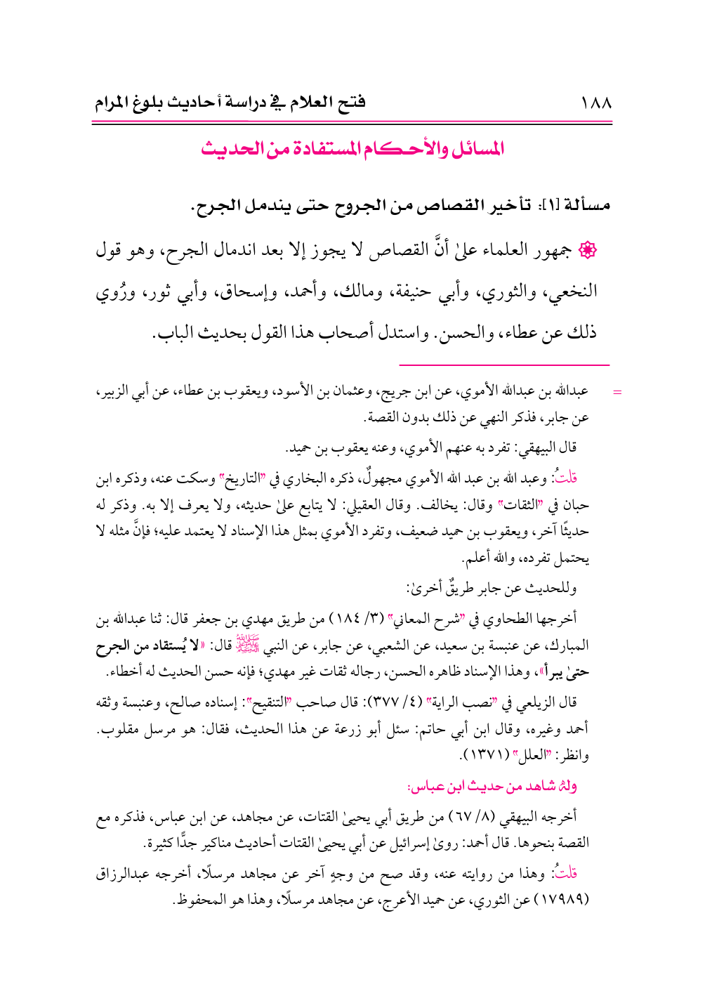 • جمهور العلماء على أنَّ القصاص لا يجوز إلا بعد اندمال الجرح، وهو قول النخعي، والثوري، وأبي حنيفة، ومالك، وأحمد، وإسحاق، وأبي ثور، ورُوي ذلك عن عطاء، والحسن. واستدل أصحاب هذا القول بحديث الباب.