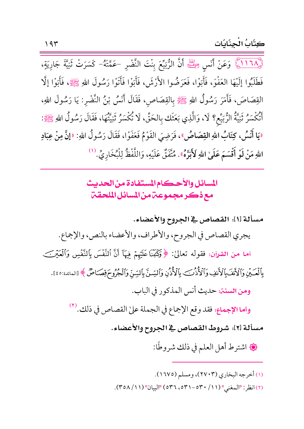 ١١٦٨ - وَعَنْ أَنَسٍ -رضي الله عنه- أَنَّ الرُّبَيِّعَ بِنْتَ النَّضْرِ -عَمَّتَهُ- كَسَرَتْ ثَنِيَّةَ جَارِيَةٍ، فَطَلَبُوا إلَيْهَا العَفْوَ، فَأَبَوْا، فَعَرَضُوا الأَرْشَ، فَأَبَوْا فَأَتَوْا رَسُولَ اللهِ - صلى الله عليه وسلم -، فَأَبَوْا إلَّا القِصَاصَ، فَأَمَرَ رَسُولُ اللهِ - صلى الله عليه وسلم - بِالقِصَاصِ، فَقَالَ أَنَسُ بْنُ النَّضْرِ: يَا رَسُولَ اللهِ، أَتُكْسَرُ ثَنِيَّةُ الرُّبَيِّعِ؟ لَا، وَالَّذِي بَعَثَك بِالحَقِّ، لَا تُكْسَرُ ثَنِيَّتُهَا، فَقَالَ رَسُولُ اللهِ - صلى الله عليه وسلم -: «يَا أَنَسُ، كِتَابُ اللهِ القِصَاصُ»، فَرَضِيَ القَوْمُ فَعَفَوْا، فَقَالَ رَسُولُ اللهِ: «إنَّ مِنْ عِبَادِ اللهِ مَنْ لَوْ أَقْسَمَ عَلَى اللهِ لَأَبَرَّهُ». مُتَّفَقٌ عَلَيْهِ، وَاللَّفْظُ لِلْبُخَارِيِّ. (¬١)