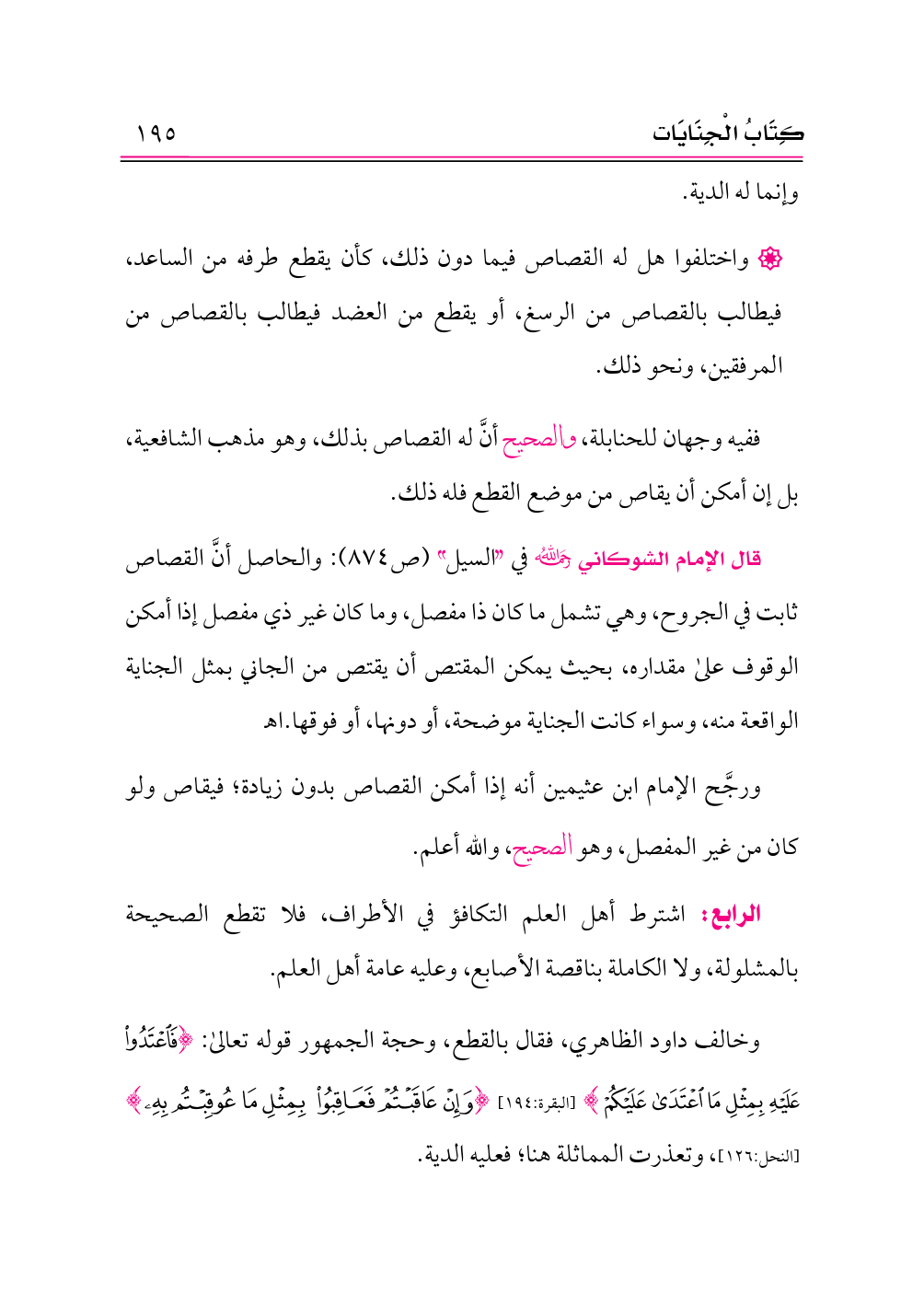 قال الإمام الشوكاني -رحمه الله- في «السيل» (ص ٨٧٤): والحاصل أنَّ القصاص ثابت في الجروح، وهي تشمل ما كان ذا مفصل، وما كان غير ذي مفصل إذا أمكن الوقوف على مقداره، بحيث يمكن المقتص أن يقتص من الجاني بمثل الجناية الواقعة منه، وسواء كانت الجناية موضحة، أو دونها، أو فوقها. اهـ
