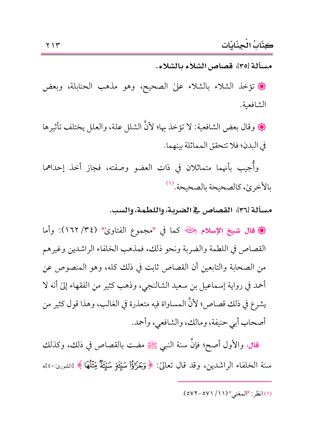 • تؤخذ الشلاء بالشلاء على الصحيح، وهو مذهب الحنابلة، وبعض الشافعية.
