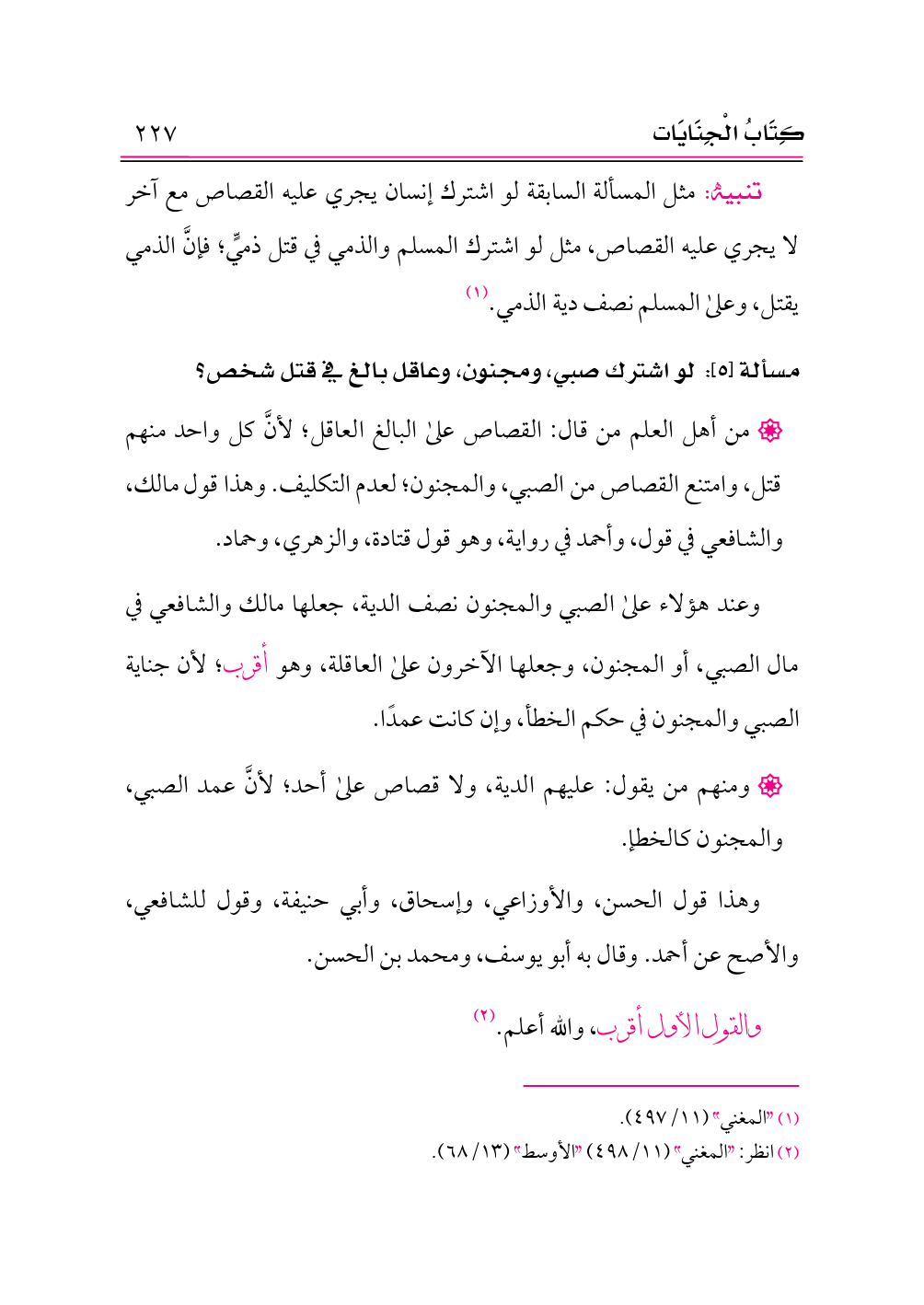 وعند هؤلاء على الصبي والمجنون نصف الدية، جعلها مالك والشافعي في مال الصبي، أو المجنون، وجعلها الآخرون على العاقلة، وهو أقرب؛ لأن جناية الصبي والمجنون في حكم الخطأ، وإن كانت عمدًا.