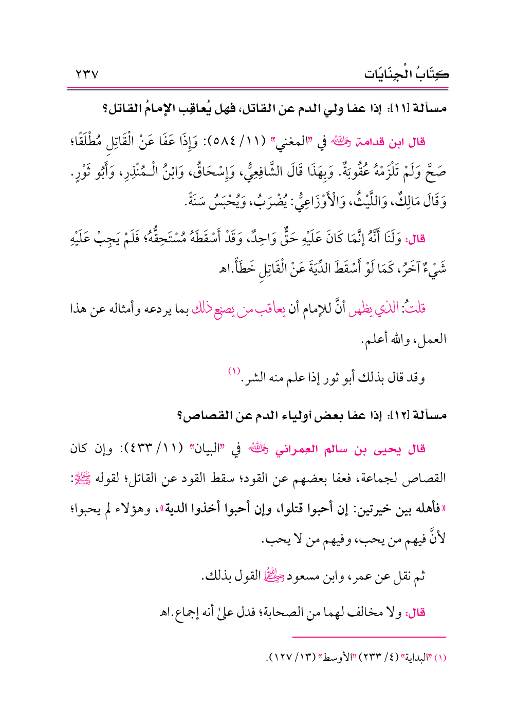 قال يحيى بن سالم العِمراني -رحمه الله- في «البيان» (١١/ ٤٣٣): وإن كان القصاص لجماعة، فعفا بعضهم عن القود؛ سقط القود عن القاتل؛ لقوله - صلى الله عليه وسلم -: «فأهله بين خيرتين: إن أحبوا قتلوا، وإن أحبوا أخذوا الدية»، وهؤلاء لم يحبوا؛ لأنَّ فيهم من يحب، وفيهم من لا يحب.