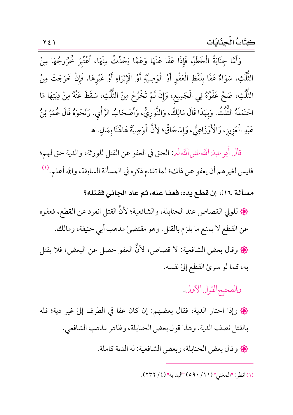 وَأَمَّا جِنَايَةُ الْخَطَأِ، فَإِذَا عَفَا عَنْهَا وَعَمَّا يَحْدُثُ مِنْهَا، اُعْتُبِرَ خُرُوجُهَا مِنْ الثُّلُثِ، سَوَاءٌ عَفَا بِلَفْظِ الْعَفْوِ أَوْ الْوَصِيَّةِ أَوْ الْإِبْرَاءِ أَوْ غَيْرِهَا، فَإِنْ خَرَجَتْ مِنْ الثُّلُثِ، صَحَّ عَفْوُهُ فِي الْجَمِيعِ، وَإِنْ لَمْ تَخْرُجْ مِنْ الثُّلُثِ، سَقَطَ عَنْهُ مِنْ دِيَتِهَا مَا احْتَمَلَهُ الثُّلُثُ. وَبِهَذَا قَالَ مَالِكٌ، وَالثَّوْرِيُّ، وَأَصْحَابُ الرَّأْيِ. وَنَحْوَهُ قَالَ عُمَرُ بْنُ عَبْدِ الْعَزِيزِ، وَالْأَوْزَاعِيُّ، وَإِسْحَاقُ؛ لِأَنَّ الْوَصِيَّةَ هَاهُنَا بِمَالٍ. اهـ