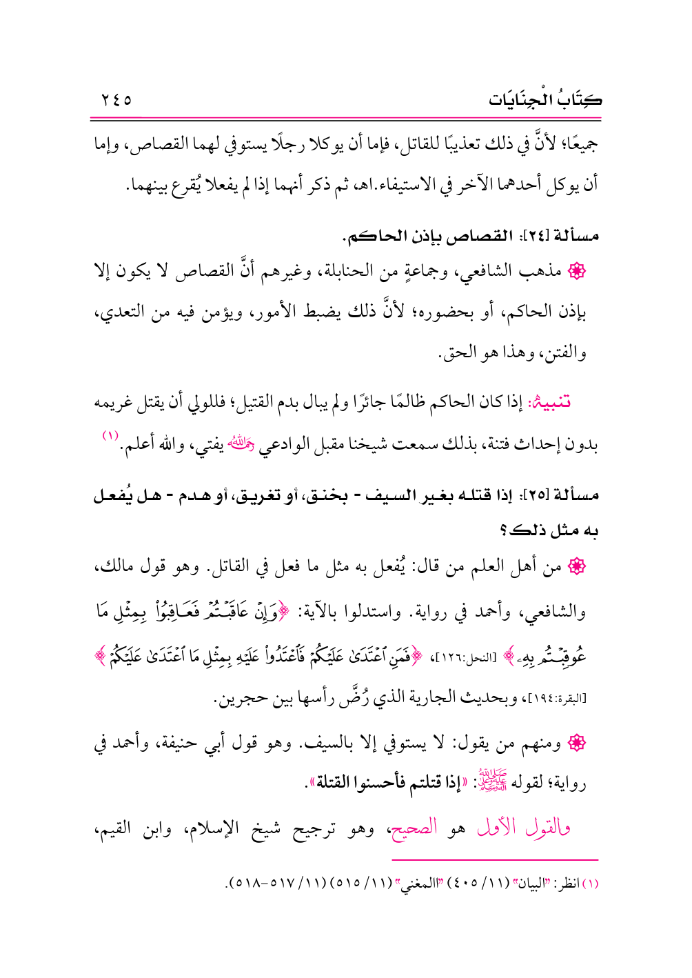 • مذهب الشافعي، وجماعةٍ من الحنابلة، وغيرهم أنَّ القصاص لا يكون إلا بإذن الحاكم، أو بحضوره؛ لأنَّ ذلك يضبط الأمور، ويؤمن فيه من التعدي، والفتن، وهذا هو الحق.