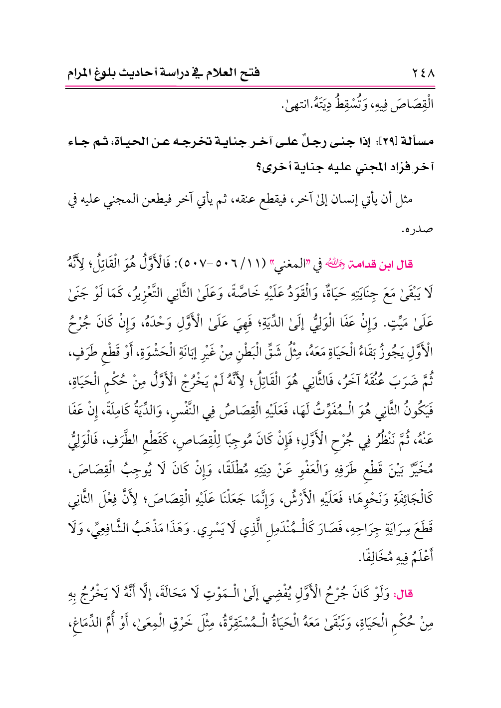 قال ابن قدامة -رحمه الله- في «المغني» (١١/ ٥٠٦ - ٥٠٧): فَالْأَوَّلُ هُوَ الْقَاتِلُ؛ لِأَنَّهُ لَا يَبْقَى مَعَ جِنَايَتِهِ حَيَاةٌ، وَالْقَوَدُ عَلَيْهِ خَاصَّةً، وَعَلَى الثَّانِي التَّعْزِيرُ، كَمَا لَوْ جَنَى عَلَى مَيِّتٍ. وَإِنْ عَفَا الْوَلِيُّ إلَى الدِّيَةِ؛ فَهِيَ عَلَى الْأَوَّلِ وَحْدَهُ، وَإِنْ كَانَ جُرْحُ الْأَوَّلِ يَجُوزُ بَقَاءُ الْحَيَاةِ مَعَهُ، مِثْلُ شَقِّ الْبَطْنِ مِنْ غَيْرِ إبَانَةِ الْحَشْوَةِ، أَوْ قَطْعِ طَرَفٍ، ثُمَّ ضَرَبَ عُنُقَهُ آخَرُ، فَالثَّانِي هُوَ الْقَاتِلُ؛ لِأَنَّهُ لَمْ يَخْرُجْ الْأَوَّلُ مِنْ حُكْمِ الْحَيَاةِ، فَيَكُونُ الثَّانِي هُوَ الْمُفَوِّتُ لَهَا، فَعَلَيْهِ الْقِصَاصُ فِي النَّفْسِ، وَالدِّيَةُ كَامِلَةً، إِنْ عَفَا عَنْهُ، ثُمَّ نَنْظُرُ فِي جُرْحِ الْأَوَّلِ؛ فَإِنْ كَانَ مُوجِبًا لِلْقِصَاصِ، كَقَطْعِ الطَّرَفِ، فَالْوَلِيُّ مُخَيَّرٌ بَيْنَ قَطْعِ طَرَفِهِ وَالْعَفْوِ عَنْ دِيَتِهِ مُطْلَقًا، وَإِنْ كَانَ لَا يُوجِبُ الْقِصَاصَ، كَالْجَائِفَةِ وَنَحْوِهَا؛ فَعَلَيْهِ الْأَرْشُ، وَإِنَّمَا جَعَلْنَا عَلَيْهِ الْقِصَاصَ؛ لِأَنَّ فِعْلَ الثَّانِي قَطَعَ سِرَايَةِ جِرَاحِهِ، فَصَارَ كَالْمُنْدَمِلِ الَّذِي لَا يَسْرِي. وَهَذَا مَذْهَبُ الشَّافِعِيِّ، وَلَا أَعْلَمُ فِيهِ مُخَالِفًا.