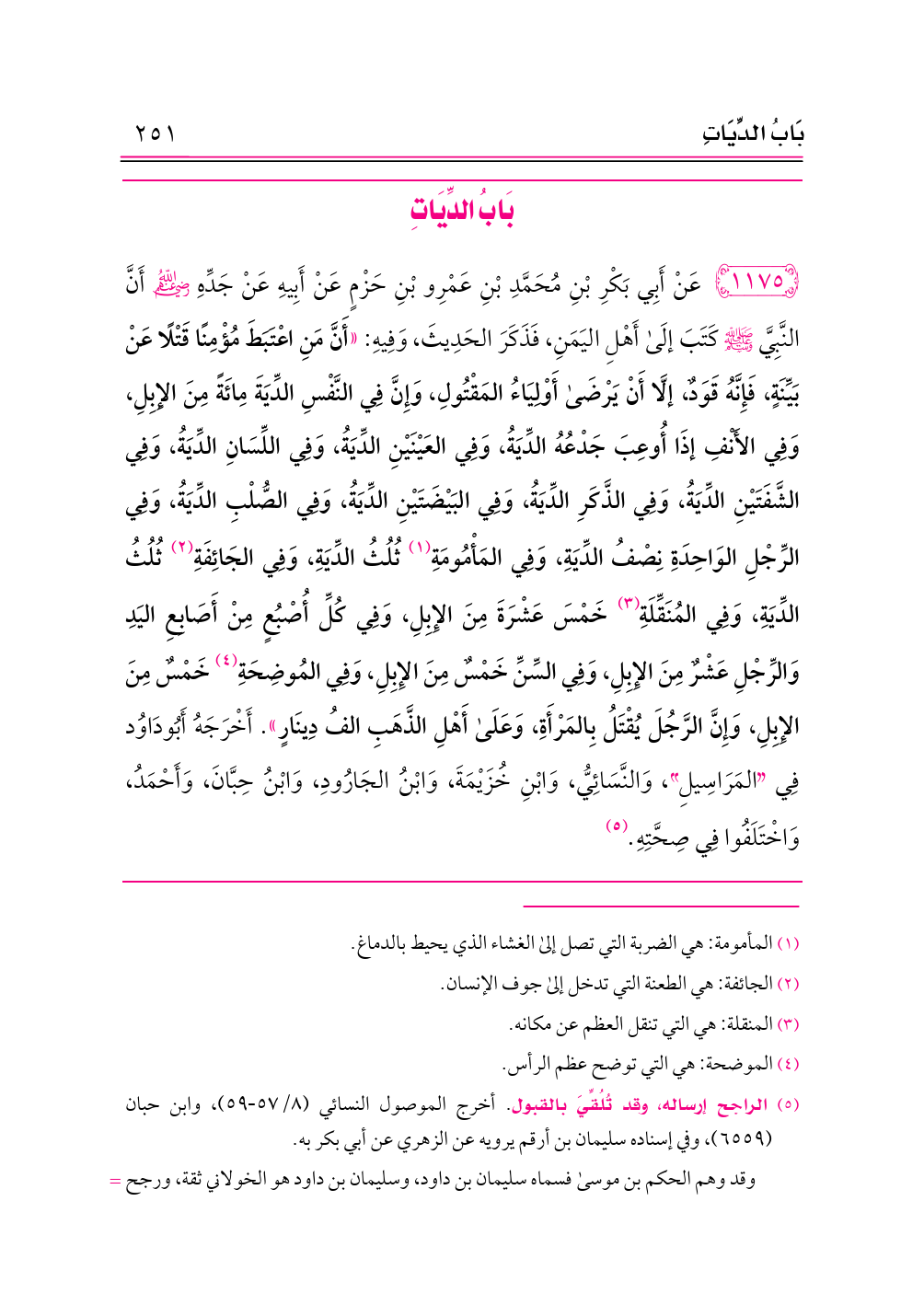 ١١٧٥ - عَنْ أَبِي بَكْرِ بْنِ مُحَمَّدِ بْنِ عَمْرِو بْنِ حَزْمٍ عَنْ أَبِيهِ عَنْ جَدِّهِ -رضي الله عنهم- أَنَّ النَّبِيَّ - صلى الله عليه وسلم - كَتَبَ إلَى أَهْلِ اليَمَنِ، فَذَكَرَ الحَدِيثَ، وَفِيهِ: «أَنَّ مَنِ اعْتَبَطَ مُؤْمِنًا قَتْلًا عَنْ بَيِّنَةٍ، فَإِنَّهُ قَوَدٌ، إلَّا أَنْ يَرْضَى أَوْلِيَاءُ المَقْتُولِ، وَإِنَّ فِي النَّفْسِ الدِّيَةَ مِائَةً مِنَ الإِبِلِ، وَفِي الأَنْفِ إذَا أُوعِبَ جَدْعُهُ الدِّيَةُ، وَفِي العَيْنَيْنِ الدِّيَةُ، وَفِي اللِّسَانِ الدِّيَةُ، وَفِي الشَّفَتَيْنِ الدِّيَةُ، وَفِي الذَّكَرِ الدِّيَةُ، وَفِي البَيْضَتَيْنِ الدِّيَةُ، وَفِي الصُّلْبِ الدِّيَةُ، وَفِي الرِّجْلِ الوَاحِدَةِ نِصْفُ الدِّيَةِ، وَفِي المَأْمُومَةِ (¬١) ثُلُثُ الدِّيَةِ، وَفِي الجَائِفَةِ (¬٢) ثُلُثُ الدِّيَةِ، وَفِي المُنَقِّلَةِ (¬٣) خَمْسَ عَشْرَةَ مِنَ الإِبِلِ، وَفِي كُلِّ أُصْبُعٍ مِنْ أَصَابِعِ اليَدِ وَالرِّجْلِ عَشْرٌ مِنَ الإِبِلِ، وَفِي السِّنِّ خَمْسٌ مِنَ الإِبِلِ، وَفِي المُوضِحَةِ (¬٤) خَمْسٌ مِنَ الإِبِلِ، وَإِنَّ الرَّجُلَ يُقْتَلُ بِالمَرْأَةِ، وَعَلَى أَهْلِ الذَّهَبِ الفُ دِينَارٍ». أَخْرَجَهُ أَبُودَاوُد فِي «المَرَاسِيلِ»، وَالنَّسَائِيُّ، وَابْنِ خُزَيْمَةَ، وَابْنُ الجَارُودِ، وَابْنُ حِبَّانَ، وَأَحْمَدُ، وَاخْتَلَفُوا فِي صِحَّتِهِ. (¬٥)