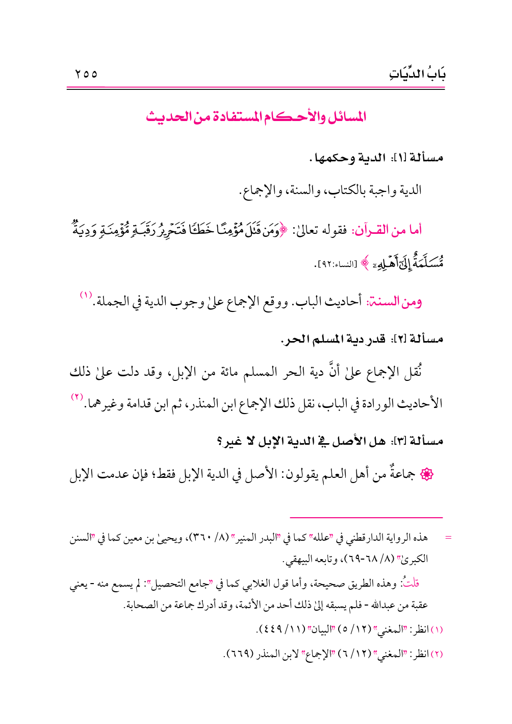 نُقل الإجماع على أنَّ دية الحر المسلم مائة من الإبل، وقد دلت على ذلك الأحاديث الورادة في الباب، نقل ذلك الإجماع ابن المنذر، ثم ابن قدامة وغيرهما. (¬٢)