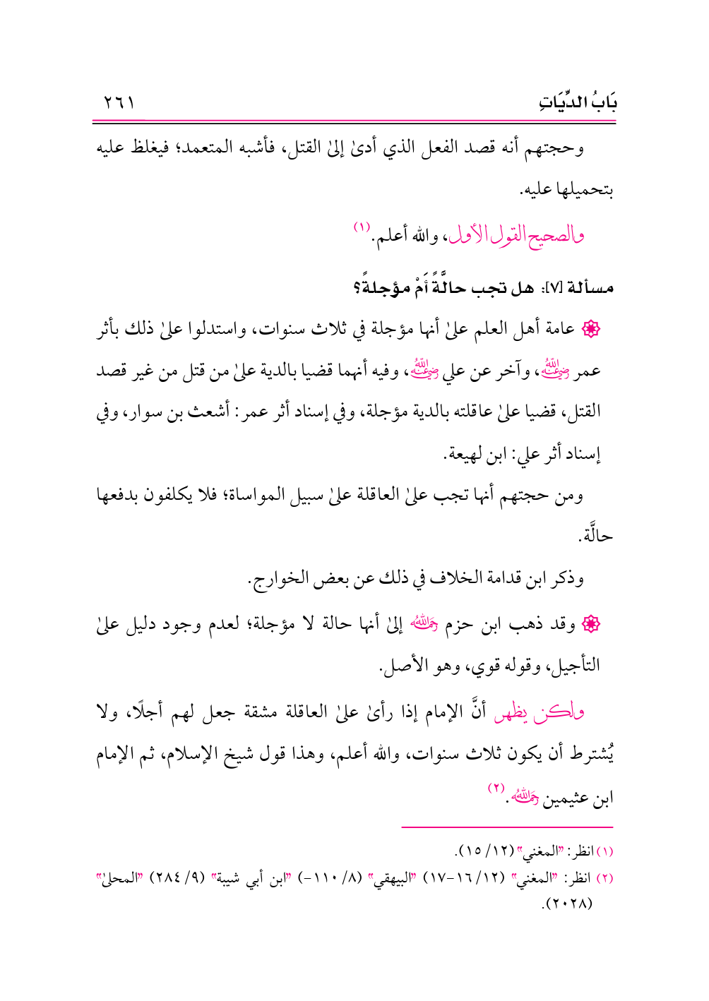 ولكن يظهر أنَّ الإمام إذا رأى على العاقلة مشقة جعل لهم أجلًا، ولا يُشترط أن يكون ثلاث سنوات، والله أعلم، وهذا قول شيخ الإسلام، ثم الإمام ابن عثيمين -رحمه الله-. (¬٢)