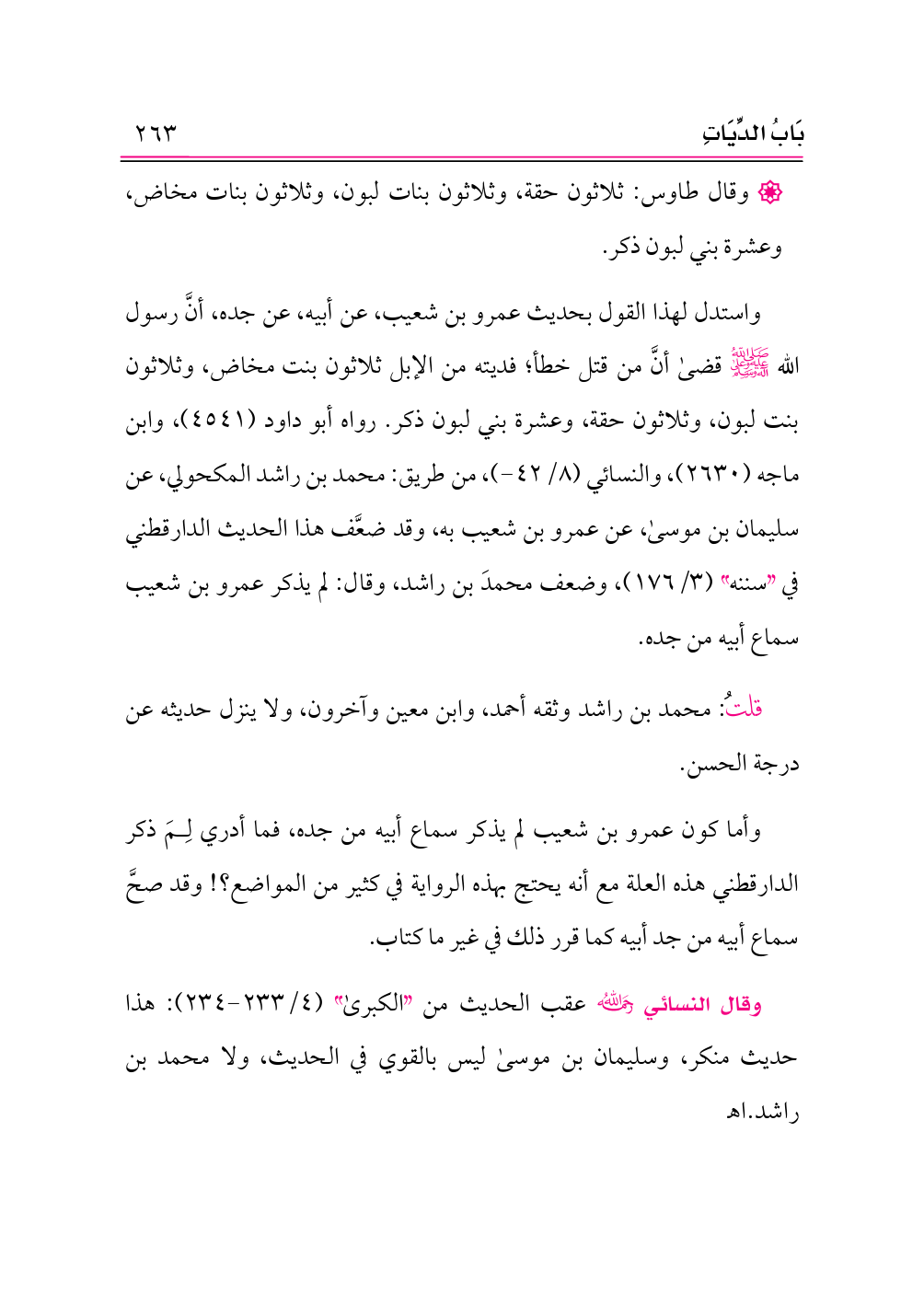 وأما كون عمرو بن شعيب لم يذكر سماع أبيه من جده، فما أدري لِمَ ذكر الدارقطني هذه العلة مع أنه يحتج بهذه الرواية في كثير من المواضع؟! وقد صحَّ سماع أبيه من جد أبيه كما قرر ذلك في غير ما كتاب.