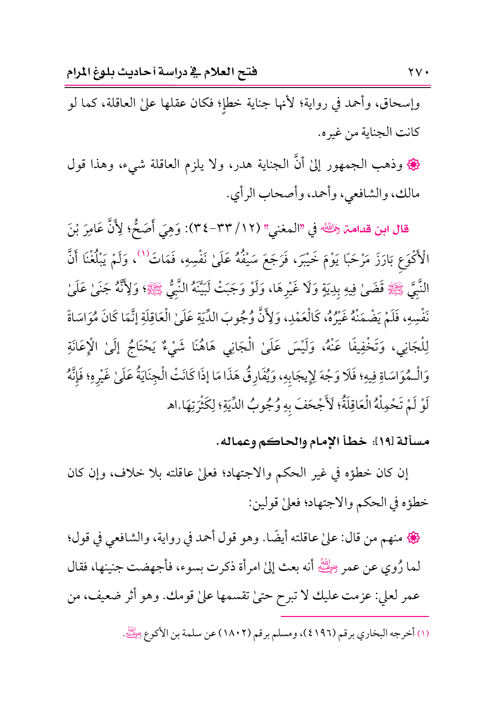 قال ابن قدامة -رحمه الله- في «المغني» (١٢/ ٣٣ - ٣٤): وَهِيَ أَصَحُّ؛ لِأَنَّ عَامِرَ بْنَ الْأَكْوَعِ بَارَزَ مَرْحَبًا يَوْمَ خَيْبَرَ، فَرَجَعَ سَيْفُهُ عَلَى نَفْسِهِ، فَمَاتَ (¬١)، وَلَمْ يَبْلُغْنَا أَنَّ النَّبِيَّ - صلى الله عليه وسلم - قَضَى فِيهِ بِدِيَةٍ وَلَا غَيْرِهَا، وَلَوْ وَجَبَتْ لَبَيَّنَهُ النَّبِيُّ - صلى الله عليه وسلم -؛ وَلِأَنَّهُ جَنَى عَلَى نَفْسِهِ، فَلَمْ يَضْمَنْهُ غَيْرُهُ، كَالْعَمْدِ، وَلِأَنَّ وُجُوبَ الدِّيَةِ عَلَى الْعَاقِلَةِ إنَّمَا كَانَ مُوَاسَاةً لِلْجَانِي، وَتَخْفِيفًا عَنْهُ، وَلَيْسَ عَلَى الْجَانِي هَاهُنَا شَيْءٌ يَحْتَاجُ إلَى الْإِعَانَةِ وَالْمُوَاسَاةِ فِيهِ؛ فَلَا وَجْهَ لِإِيجَابِهِ، وَيُفَارِقُ هَذَا مَا إذَا كَانَتْ الْجِنَايَةُ عَلَى غَيْرِهِ؛ فَإِنَّهُ لَوْ لَمْ تَحْمِلْهُ الْعَاقِلَةُ؛ لَأَجْحَفَ بِهِ وُجُوبُ الدِّيَةِ؛ لِكَثْرَتِهَا. اهـ