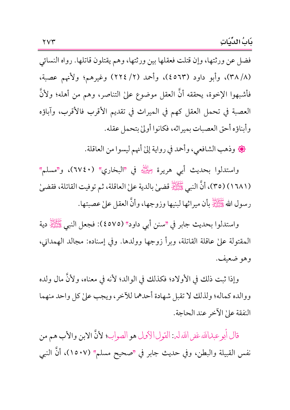 واستدلوا بحديث جابر في «سنن أبي داود» (٤٥٧٥): فجعل النبي -صلى الله عليه وعلى آله وسلم- دية المقتولة على عاقلة القاتلة، وبرأ زوجها وولدها. وفي إسناده: مجالد الهمداني، وهو ضعيف.